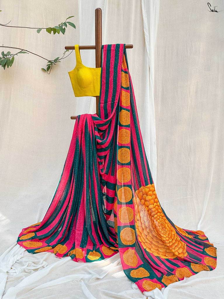 Saree: Su, the model is wearing a size S blouse and the saree called Kaner Sa Basant