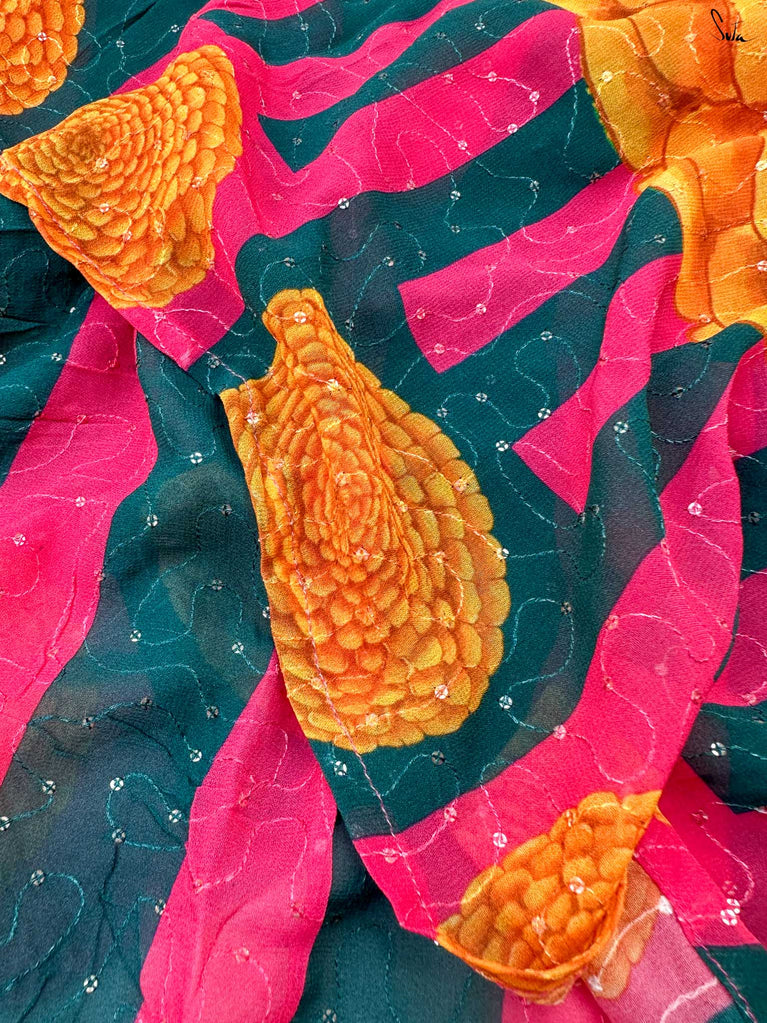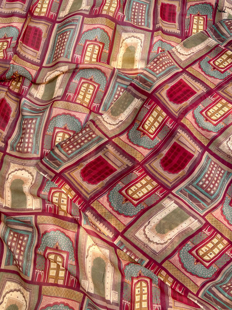 This is a green and multi-coloured raw silk blouse with digital-printed dreamy floral designs.