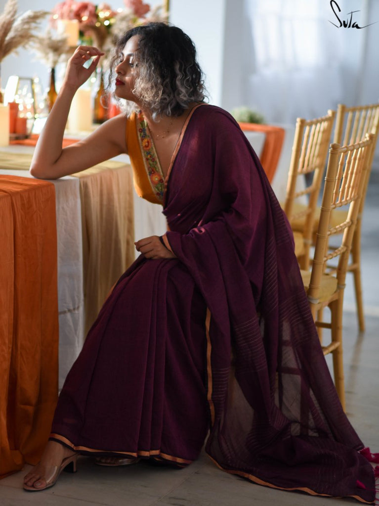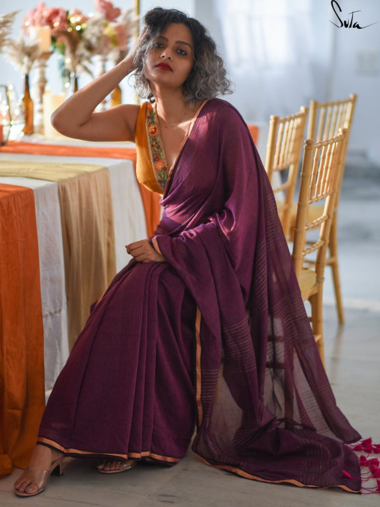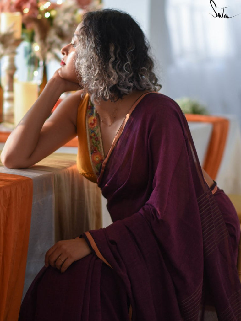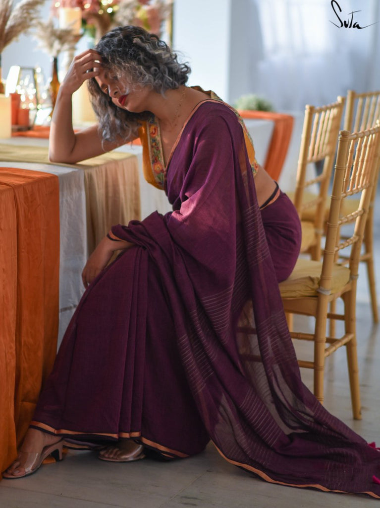 Inspired by the first ray of dawn, Dancing Dhoop makes you dance with joy. This Purple and magenta mul cotton saree brings two bright moods in one soft drape.Woven zari lines grace the pallu, while orange accents add a playful charm to the saree. Pink and purple tassels at the edges bring a touch of cheer. This piece is perfect for breezy brunches and carefree evenings.