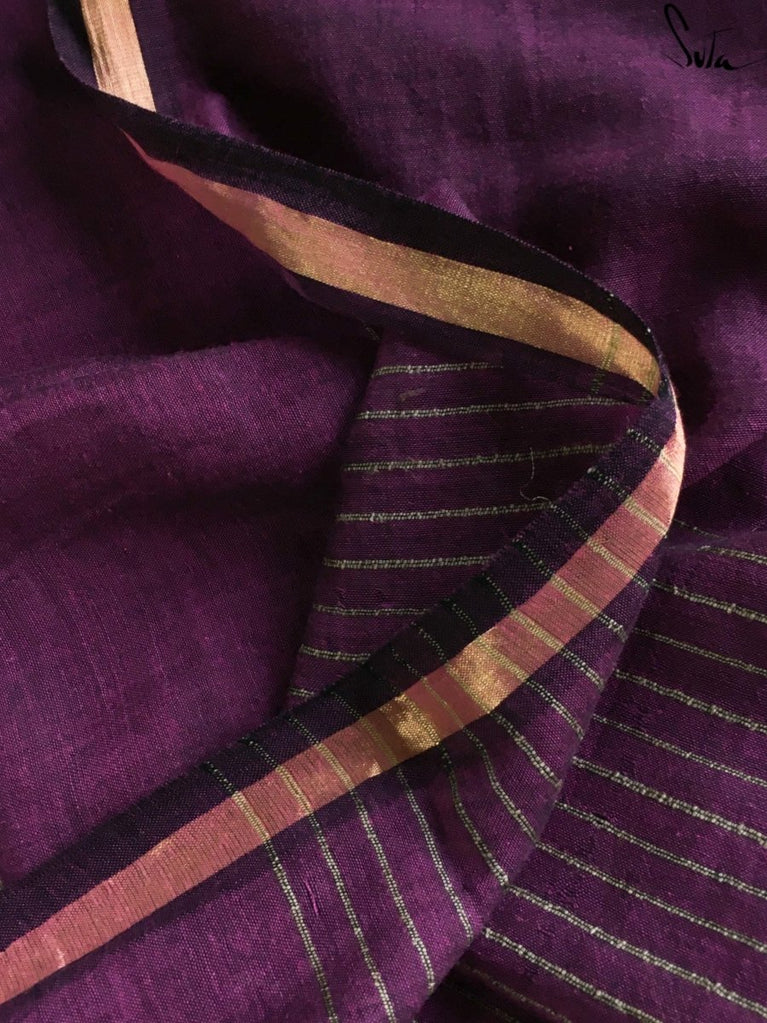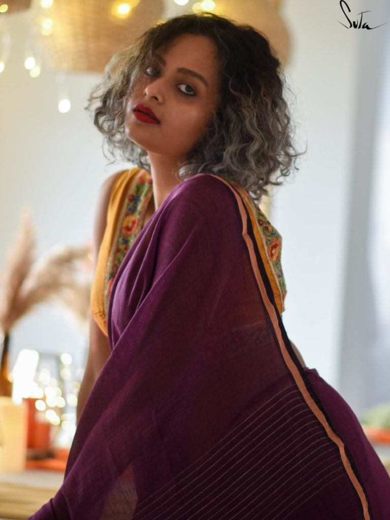 True to her name, Bondona wove this cotton-acrylic saree with prayerful attention to every detail. The rich purple body shimmers with allover gold zari floral motifs, finished with a solid gold pallu and matching tassels.