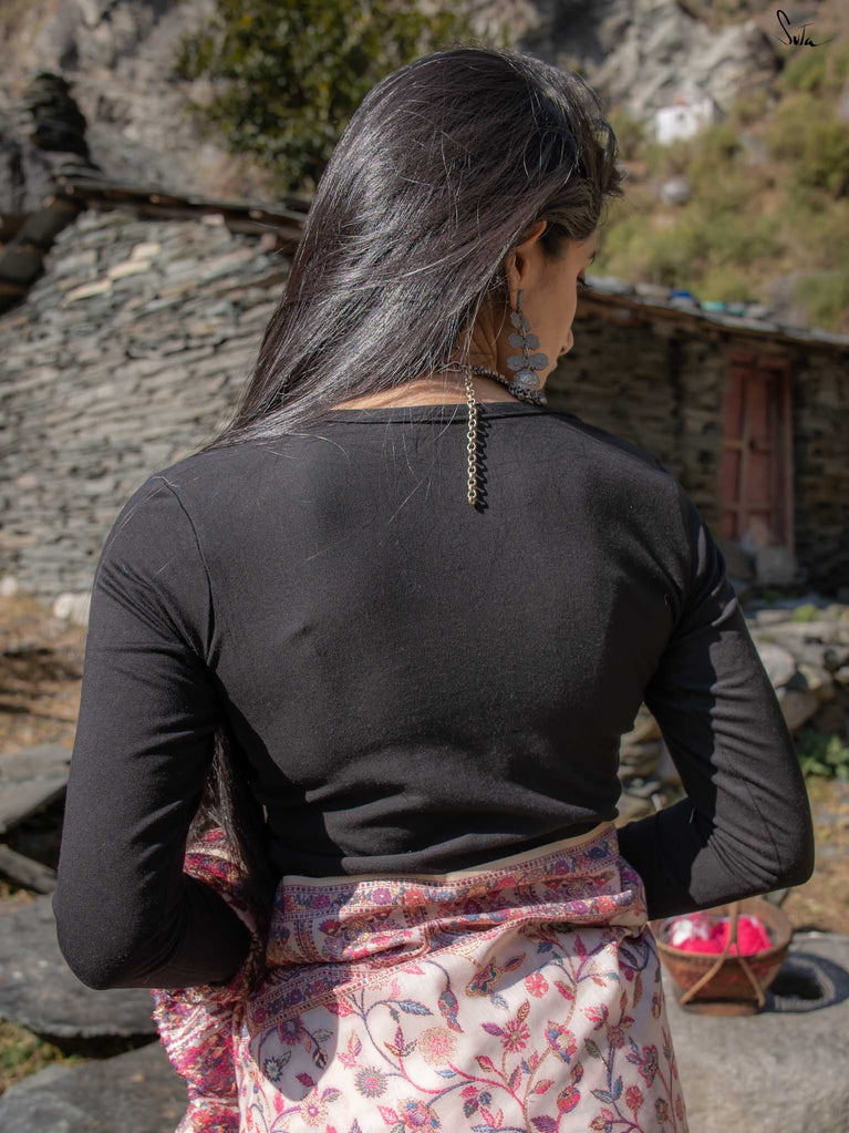 Brishti is one of our most skilled weavers. So many songs have been sung about rain, and we couldn’t think of a better way to honor her magic than in this blouse she made. This pink viscose-blend piece elevates any saree with its flattering V-neck and elbow-length sleeves. Padded and fitted with side elastic, it shapes beautifully while keeping you comfortable.
