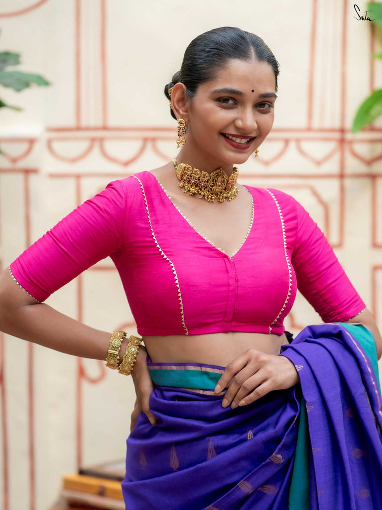 The model is wearing a size S blouse and the saree is Dipped in Gulaab.