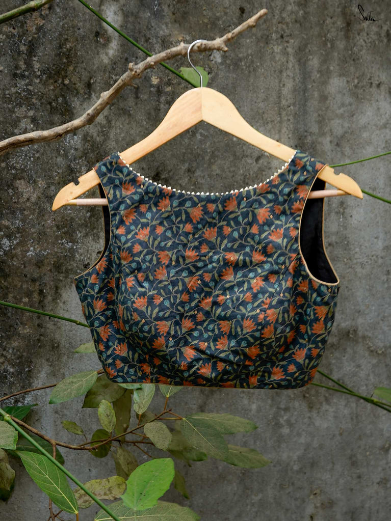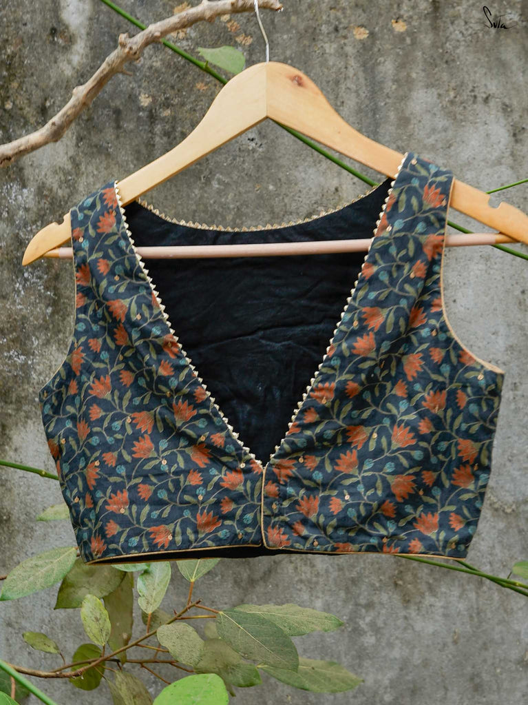 Your unique summer style this season is Floral Andaaz. This sleeveless floral cotton blouse has dainty gold chumkis scattered like sunshine. It’s padded, with a boat neck, V-back, and back hook opening. Gold piping and samosa lace at the neckline add a festive touch. This limited edition blouse is perfect for Summer weddings, garden parties, or photo sessions.