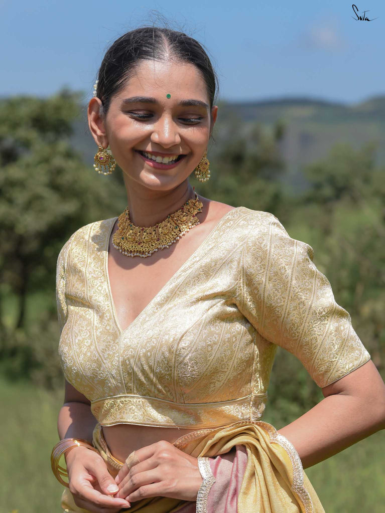 Elegant, radiant, and timeless, the Champagne Gold adds a subtle shimmer to any saree look. Crafted from luxurious brocade fabric, this blouse features intricate floral embroidery, a flattering V-neckline, and half sleeves for a classic appeal. The back-open design with hook closure ensures comfort while maintaining a graceful fit. Perfect for weddings, festive celebrations, or evening occasions, it’s a versatile addition to your festive wardrobe.