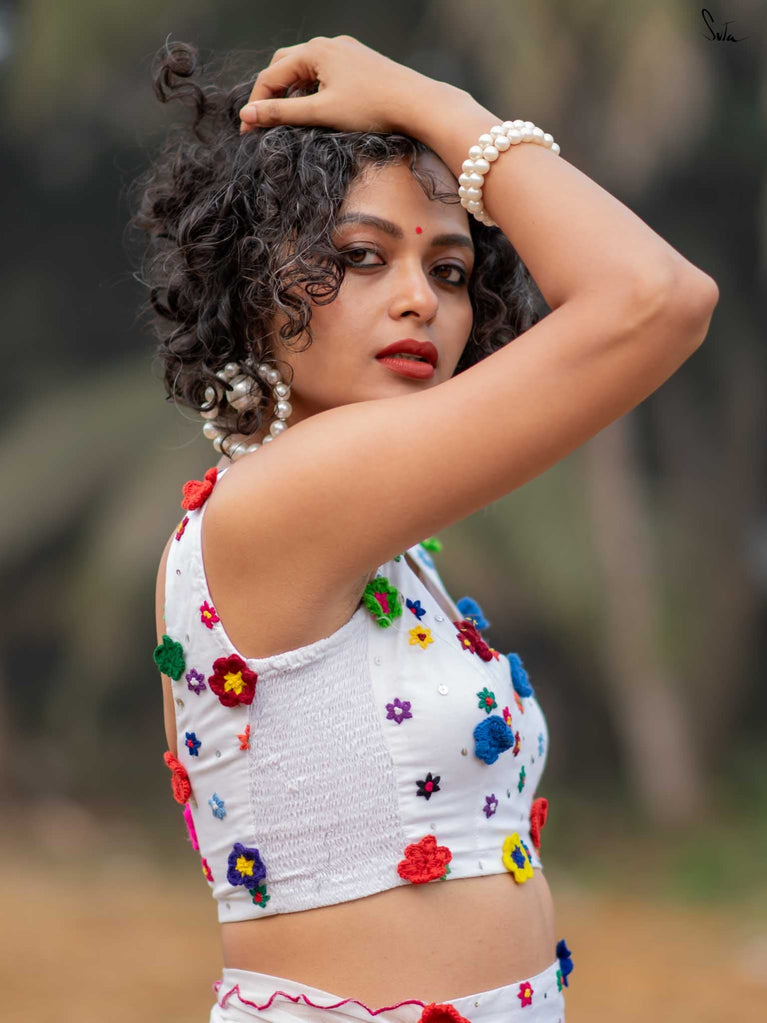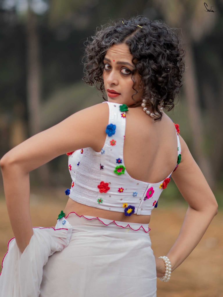 Su, the model is wearing size S blouse and saree is Marigold Scallops.