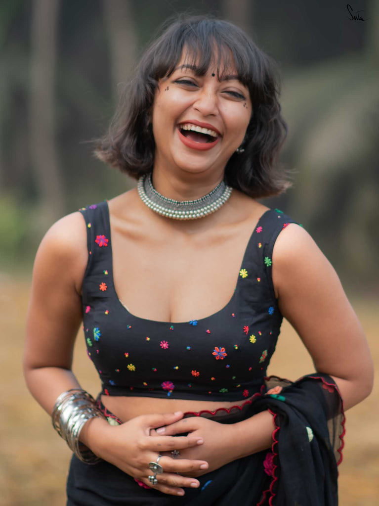 The model is wearing size S blouse and the saree is Dipped in Colours