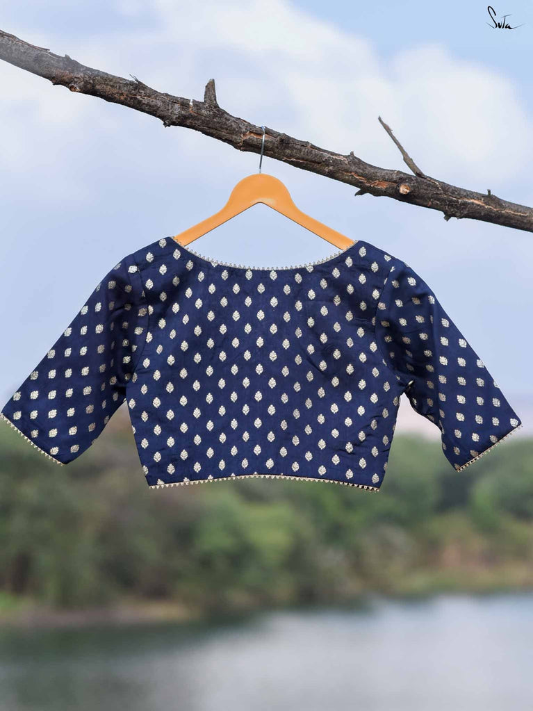 Traditional charm meets festive glamour in the Green Gold. Crafted from rich brocade fabric, this blouse features exquisite machine zari embroidery in intricate floral motifs. The elegant sweetheart neckline and half sleeves bring a timeless appeal, while the back-open hook closure ensures a comfortable and flattering fit. Perfect for pairing with silk or zari sarees, it’s an effortlessly regal choice for weddings and festive celebrations.