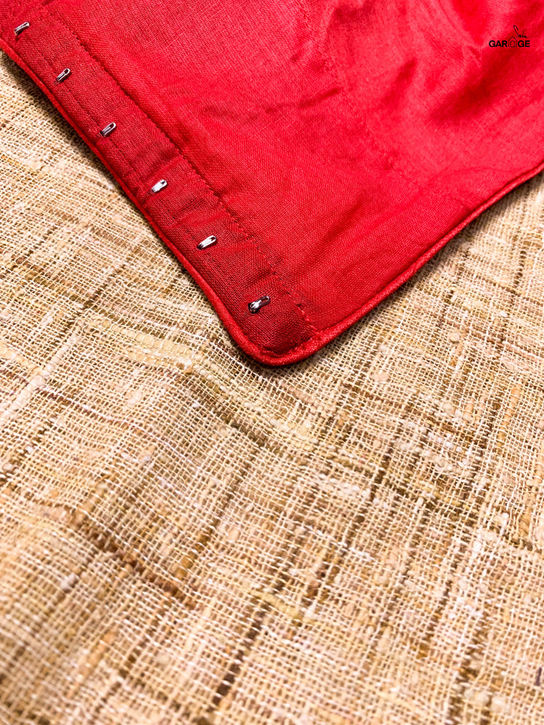 Fiery, fearless, and full of life, this sleeveless red cotton blouse is the perfect match for every Holi revelry. The bold U-neck, thick straps, and back hook opening create a structured, confident silhouette. With the Elas-Tech fit, it moves with you, ensuring maximum comfort as you dive into the festive spirit, feeling as good as you look. The 3-inch elastic shirring allows it to stretch, providing both flexibility and support.
