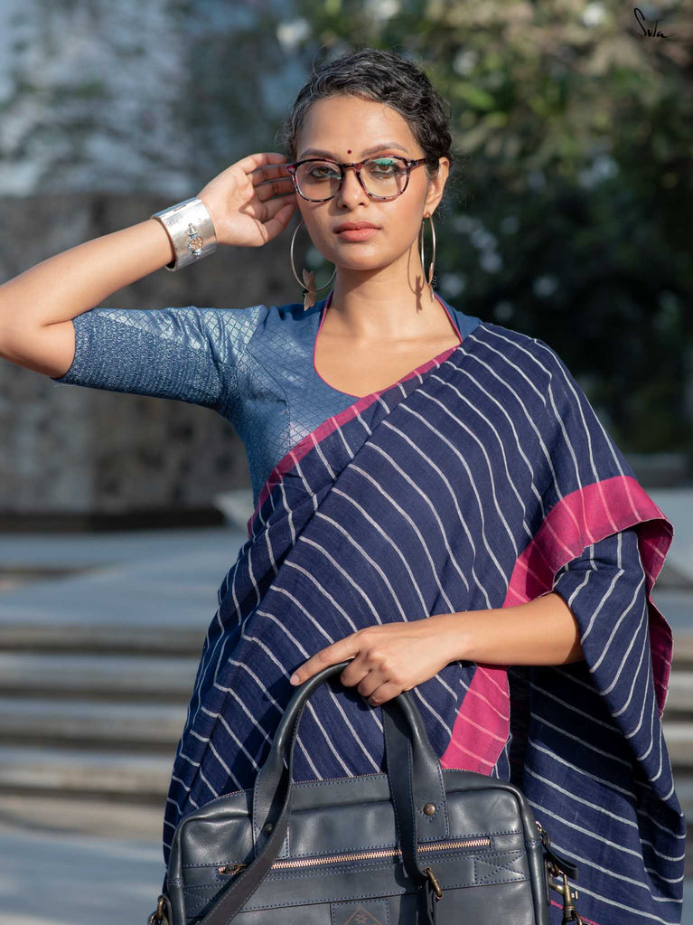 The model is wearing size S blouse and the saree is Chulbuli Indiglow