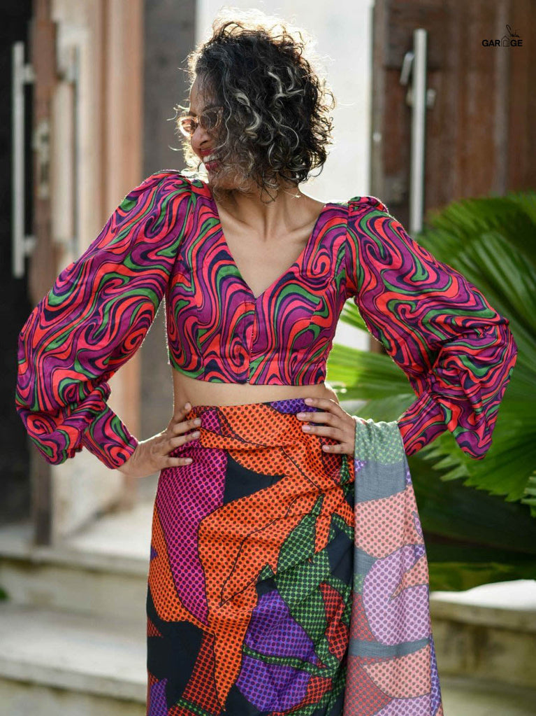 Ta, the model is wearing a size M blouse and the saree is Exuberant-O-Clock
