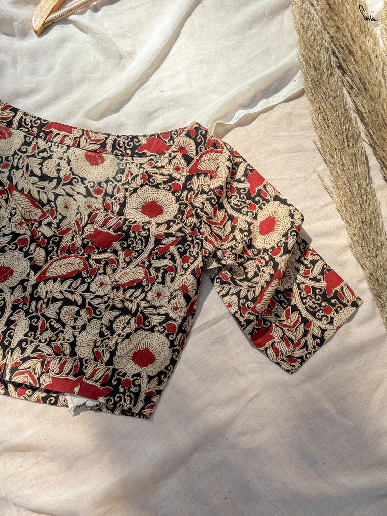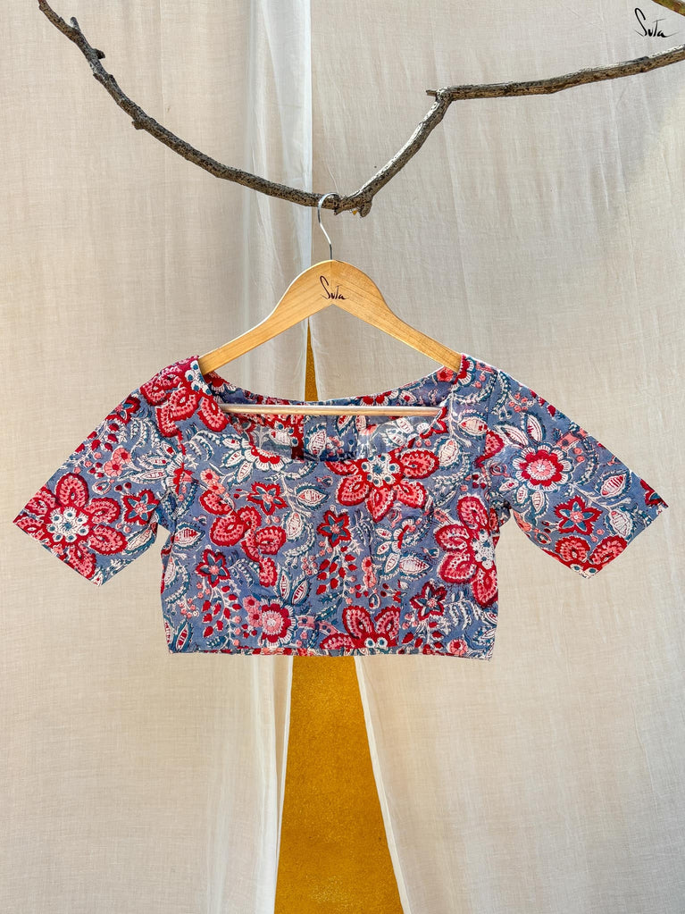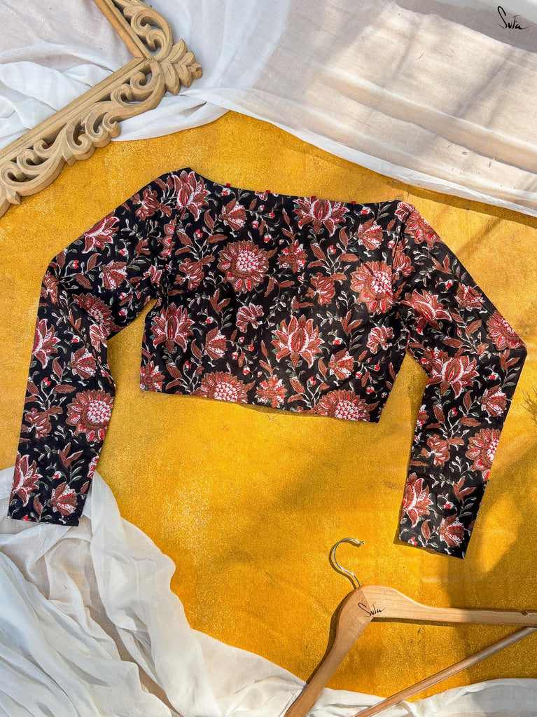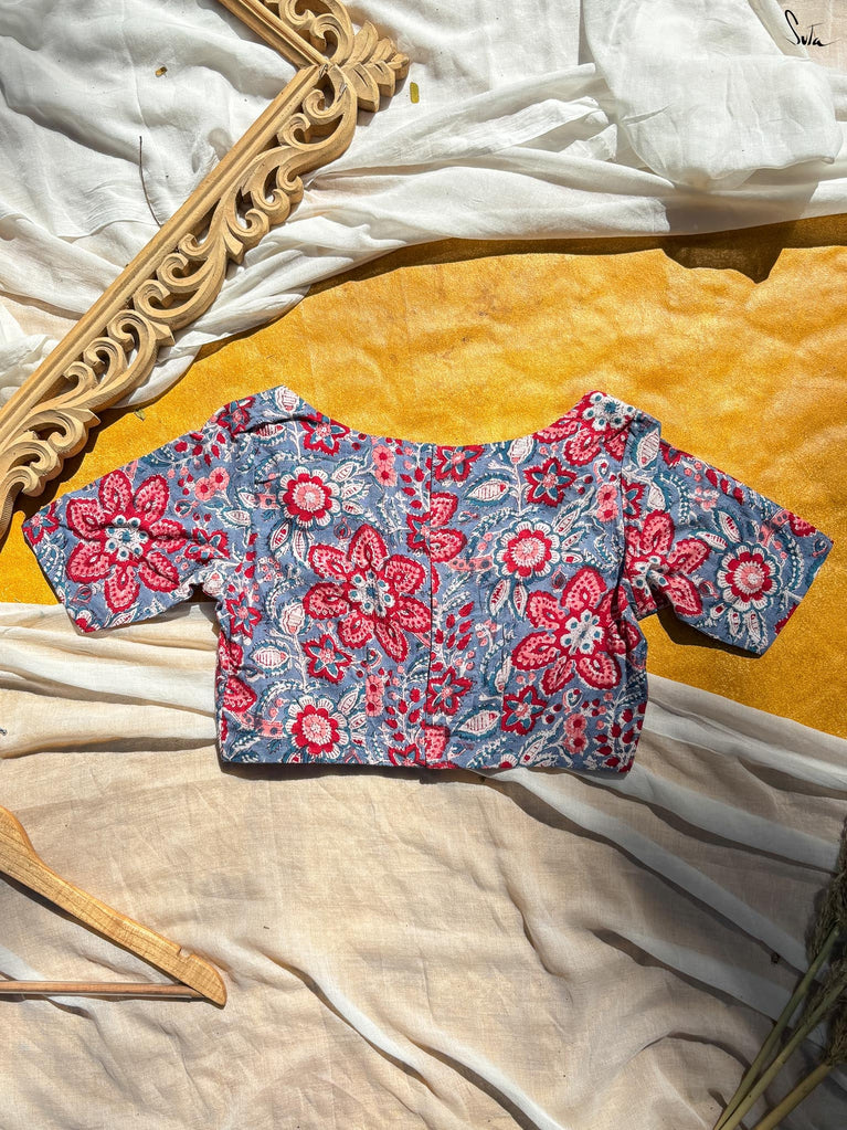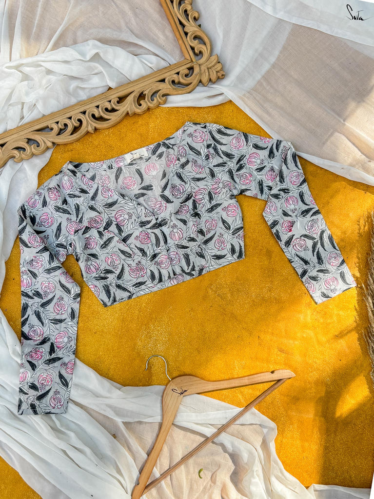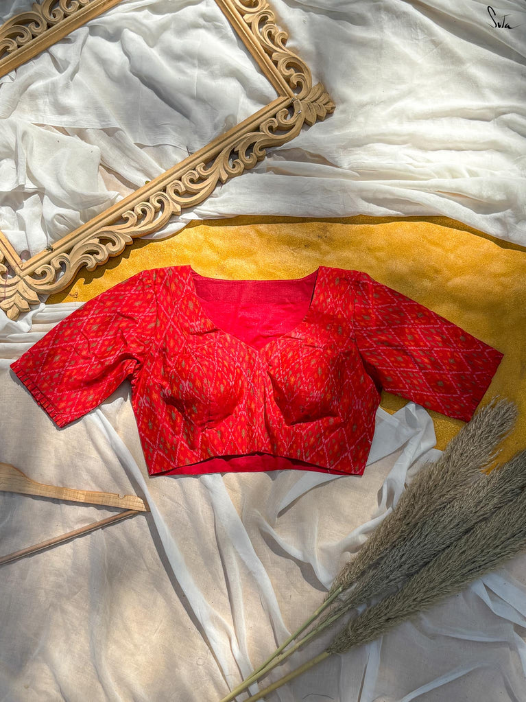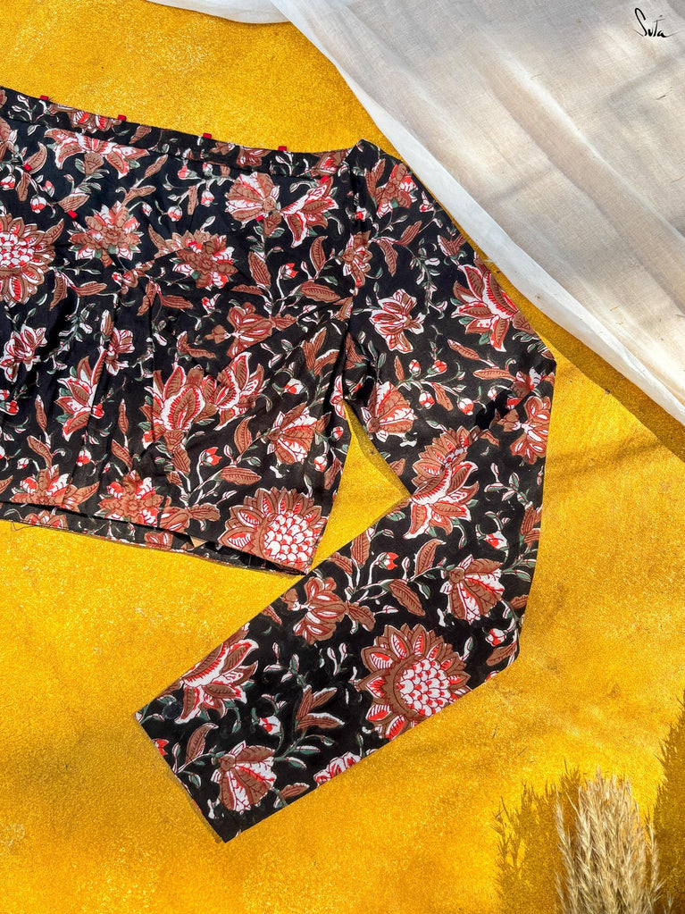 Around Bust: 84cm Waist: 68.5 cmShoulder: 31 cmSleeve Length: 51cm Sleeve Loose:20cm Armhole: 40 cmFront Neck Depth: 18 cmBack Neck Depth: 2 cmShoulder Strap: 3 cm Blouse Length: 35 cmNeck Line: round Neck Opening: Front Hook Type: Non Padded