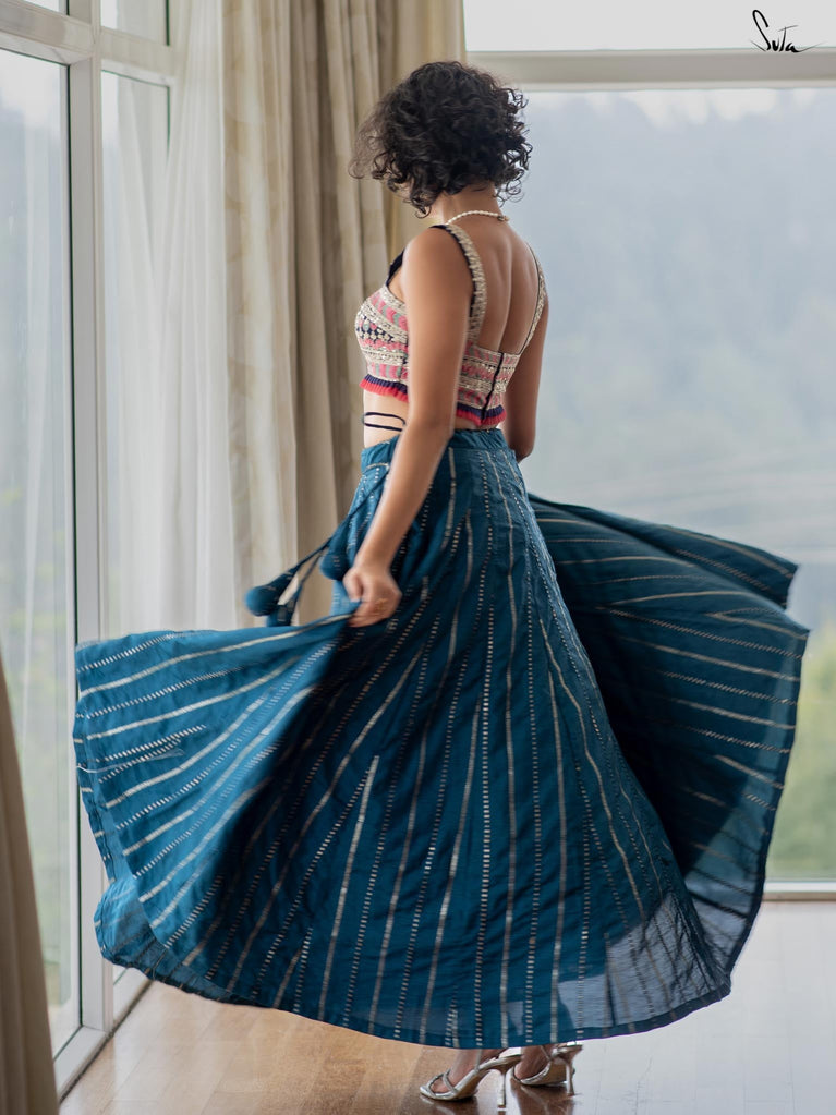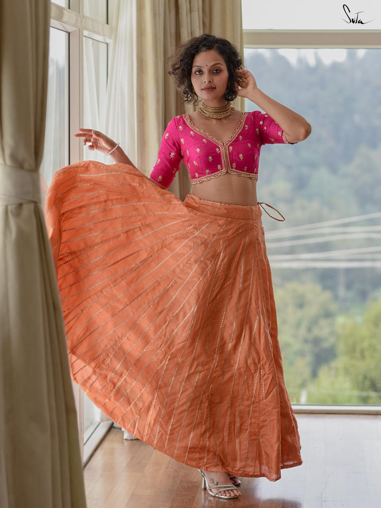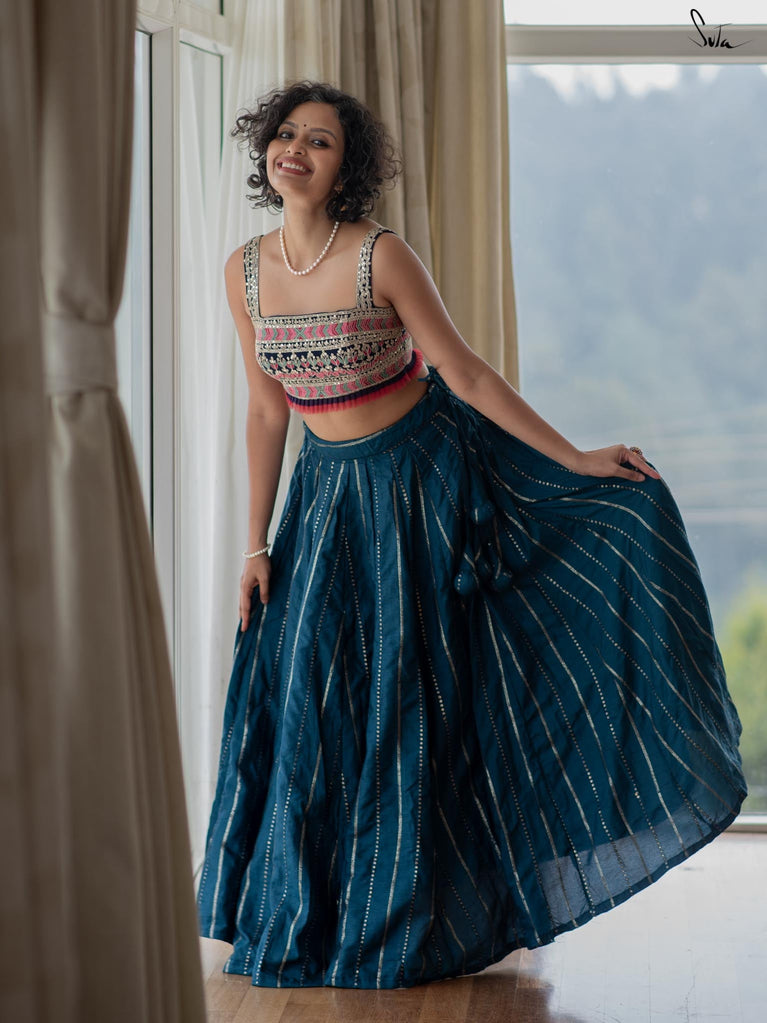 It was 5 am on a cold winter’s morning and Niharika was already wide awake. It was the first day of her wedding festivities. She was only hours away from being swept away by the hustle and bustle. But for now, her world was tranquil and calm. Her soulmate was her childhood sweetheart, with whom she had gone through many ups and downs. While she was happy, she could not help the nostalgia that washed over her, as she gazed out at the lawn, the big dahlias and the vibrant the rose bushes she had grown up amidst. In the horizon, dew drops sparkled on the leaves of the trees surrounding their house. And, as she stood there, the inevitability of change dawned on her. Today her life would change forever, but, for now, she would reminisce about the life she was leaving behind.Capture your most beautiful memories in this gorgeous art silk lehenga.