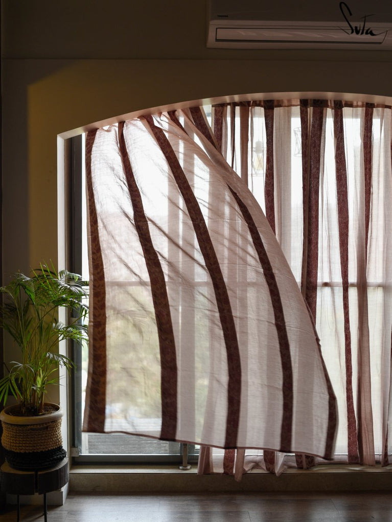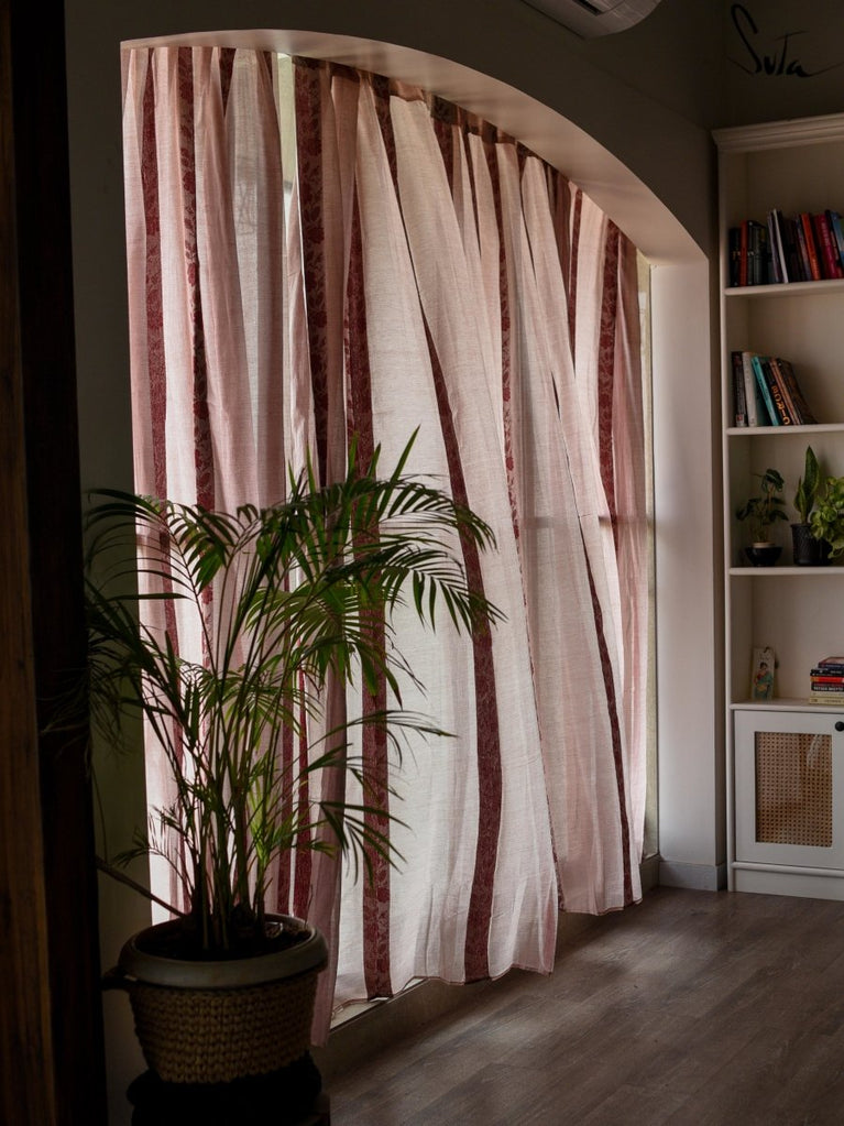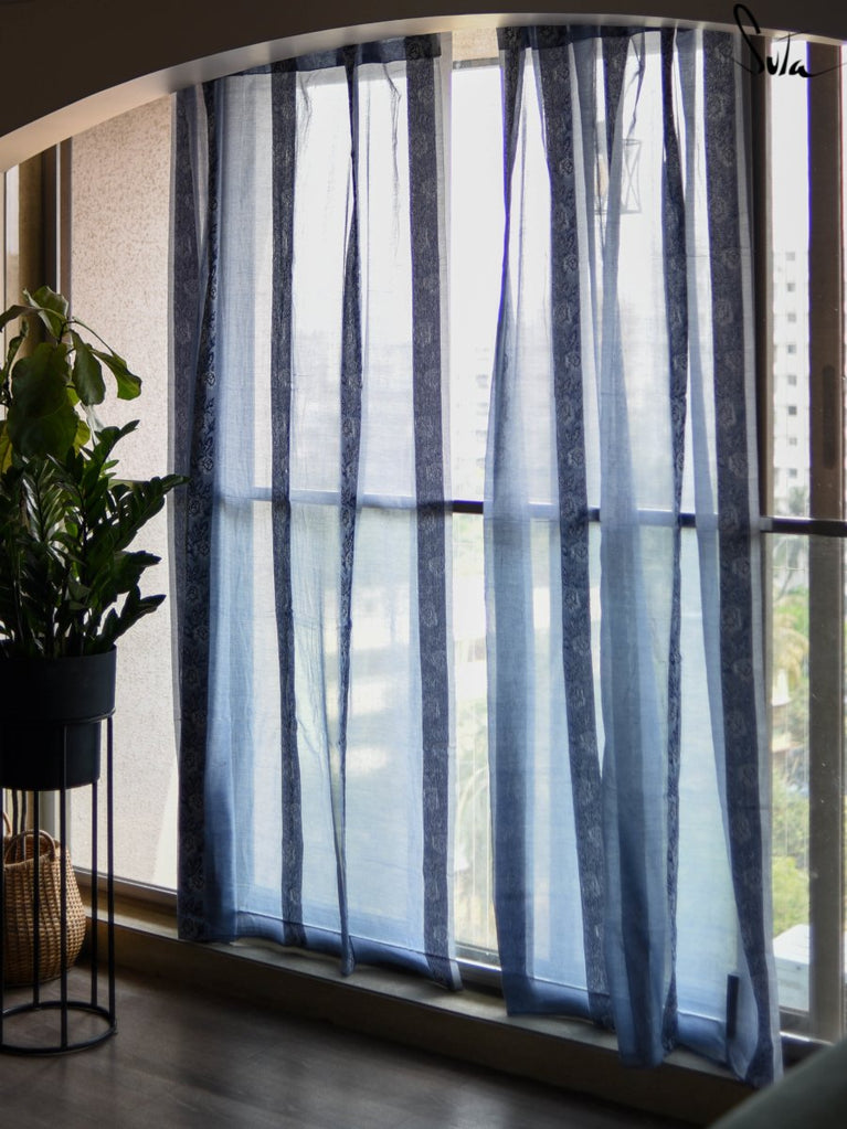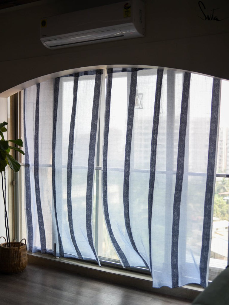 Suta’s signature ‘made in heaven’ mul cotton, is also known as mul mul in West Bengal. The fabric is buttery soft and has a delicate beauty. Its weave is very fine and this lends a very fluid texture to the fabric. These curtains also feature woven floral motifs to add an air of sophistication to the fabric.