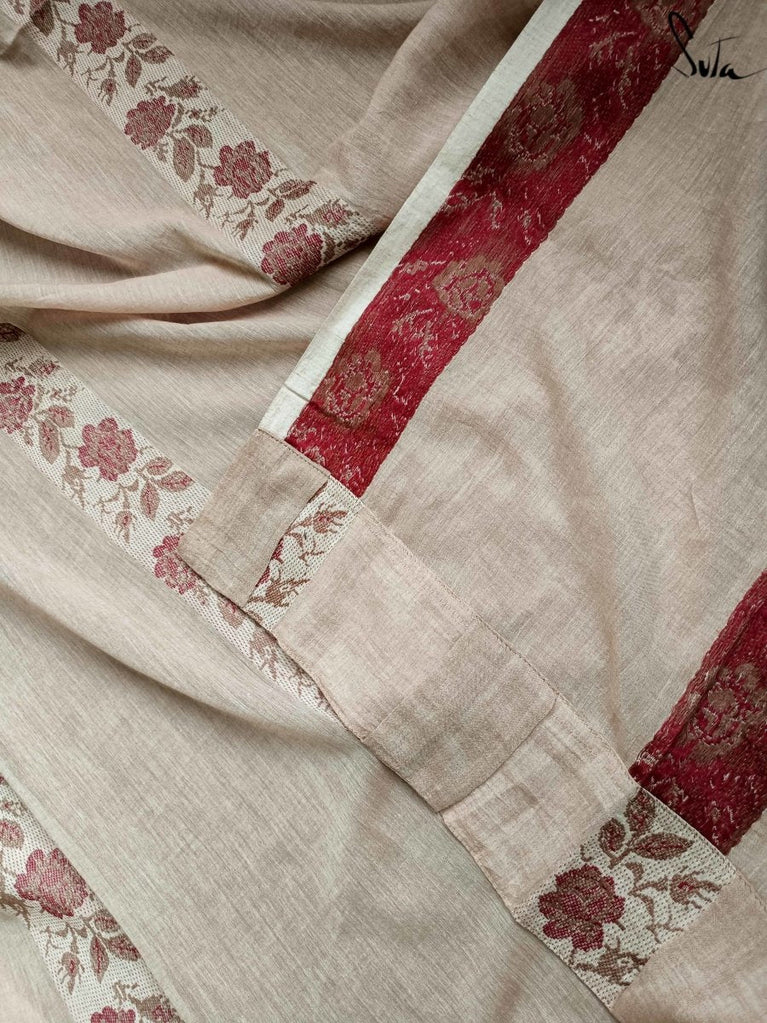 This saree has been handwoven by a master weaver in the Mashru tradition. The Mashru weave is said to have originated in West Asia, in the 19th Century. The fabric is woven with a silk weft and a fine cotton warp. It thus combines the ageless comfort of cotton and the timeless aesthetic of silk, elevated by the presence of gold and silver zari.
