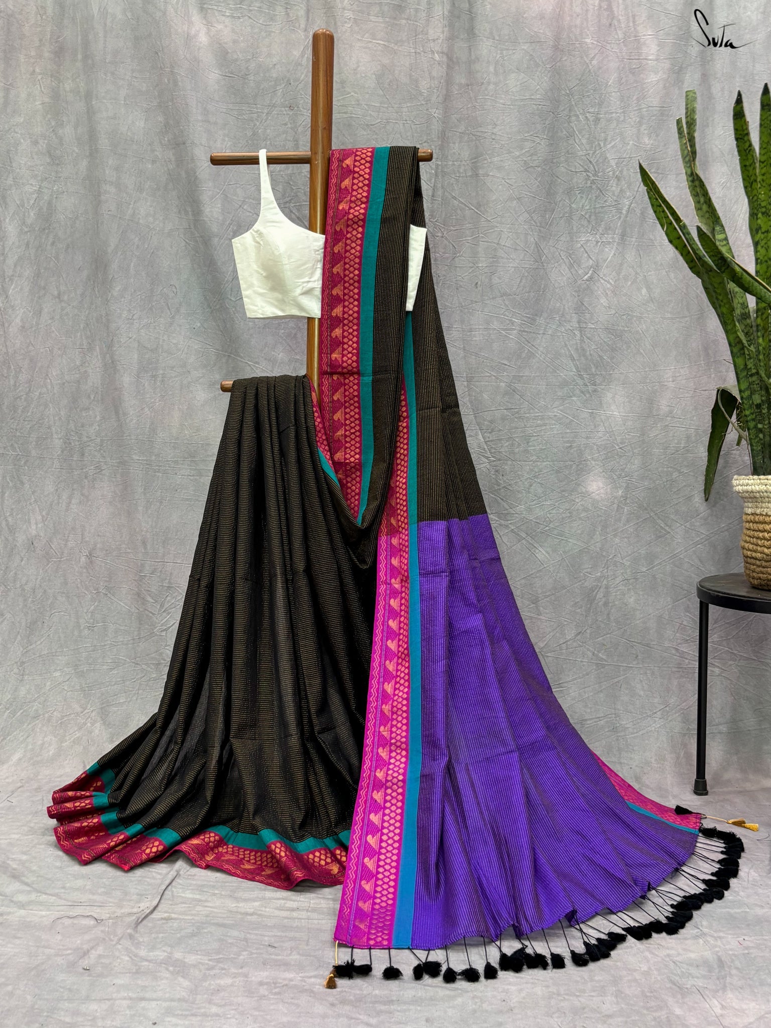 The exquisite 'Andheri Raat' saree is crafted from rich acrylic cotton with zari and features a contrasting pallu that playfully complements the black base. A contrasting thick zari border adds an extra layer of charm to this beautiful ensemble. Pair it with Suta's 'Surabhi' blouse and experience the colorful magic behold!