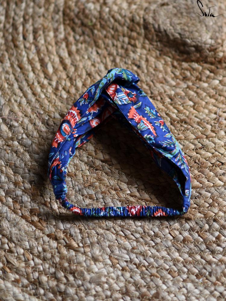 This blue hairband is made of blockprinted cotton fabric.