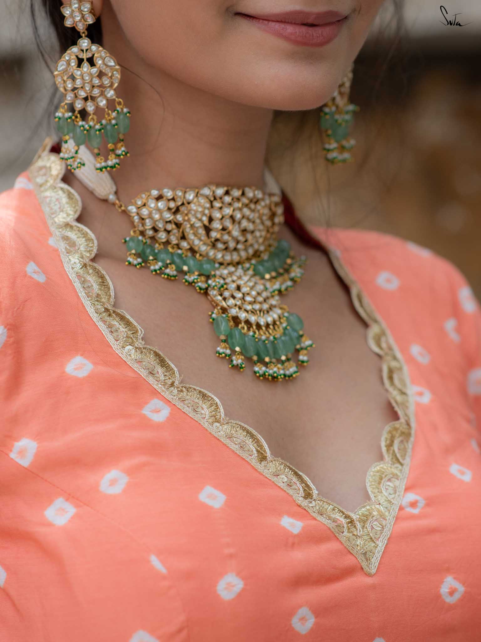 Blush is a sophisticated Orange blouse from the Rangrez collection, crafted to blend heritage artistry with modern elegance. Made in soft cotton muslin, it features traditional Bandhani tie-dye patterns and 1/4th sleeves with a classic collar neck. The gold lace detailing on the sleeves and neckline adds a subtle festive shimmer, making Blush a perfect companion for Rangrez sarees or as a standalone statement for celebrations.
