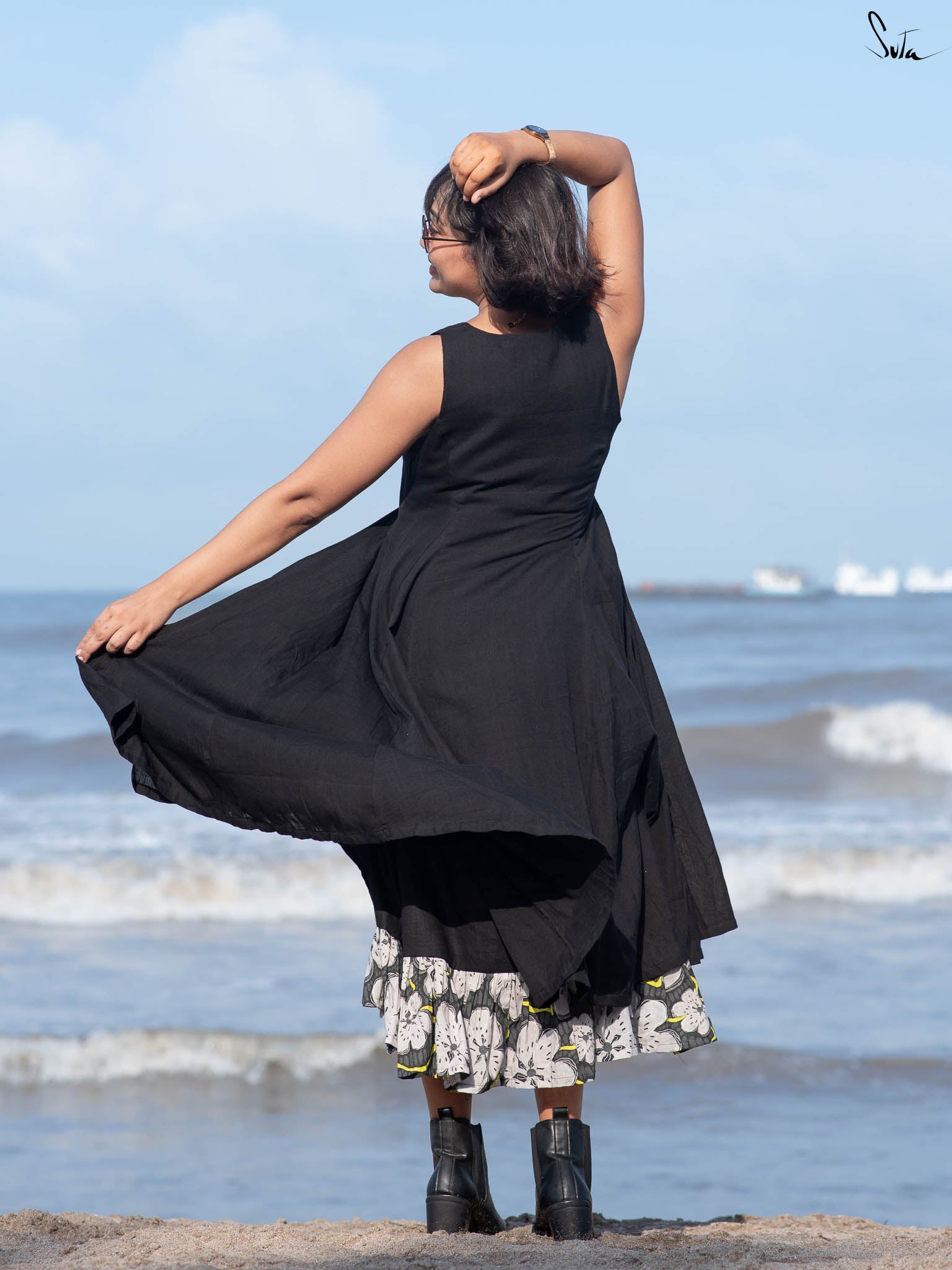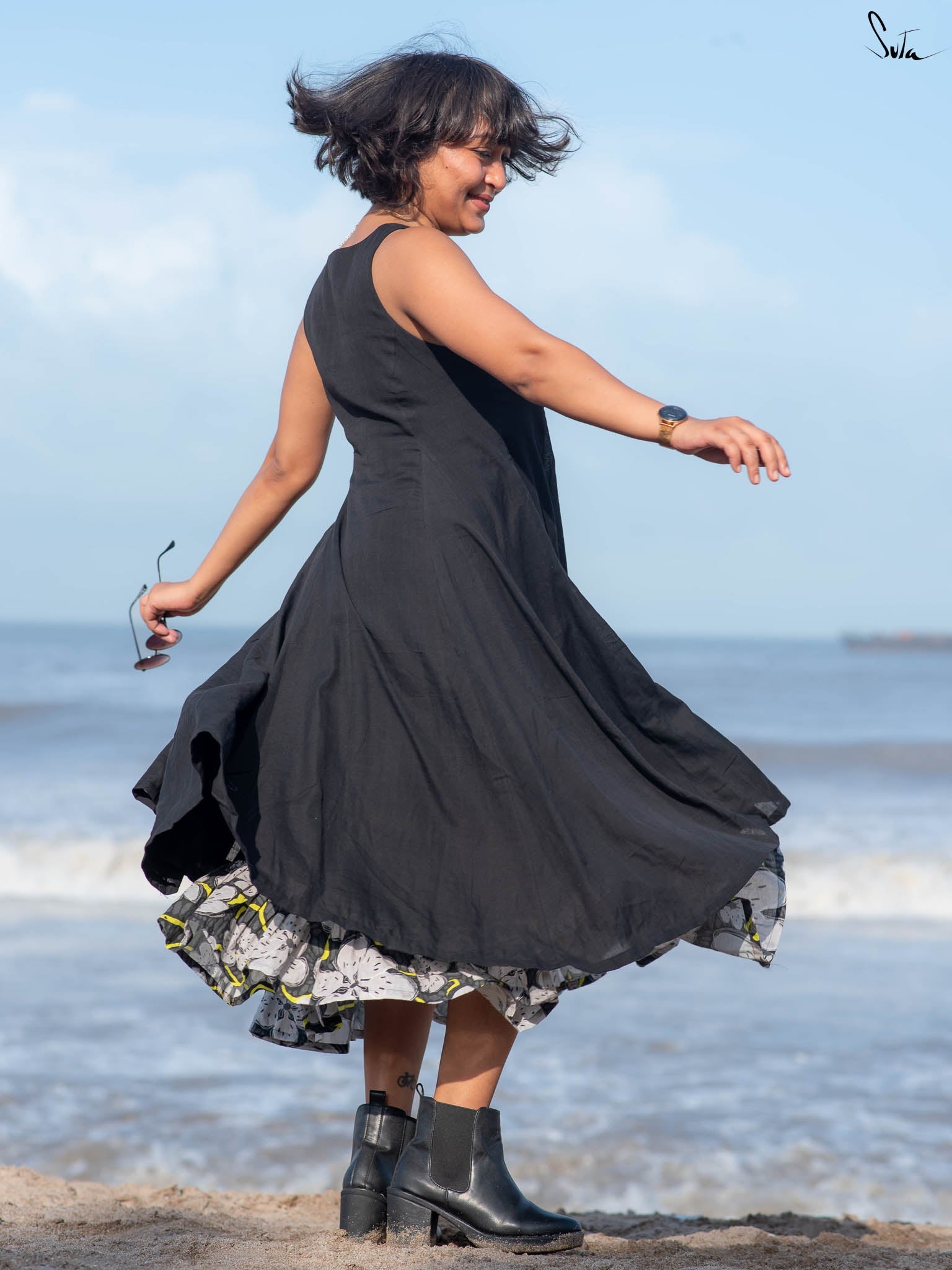 A blend of solid panels and floral print, this dress channels a carefree spirit rooted in balance. The digital artwork adds bursts of color without overwhelming, while soft frills at the hem bring gentle movement.