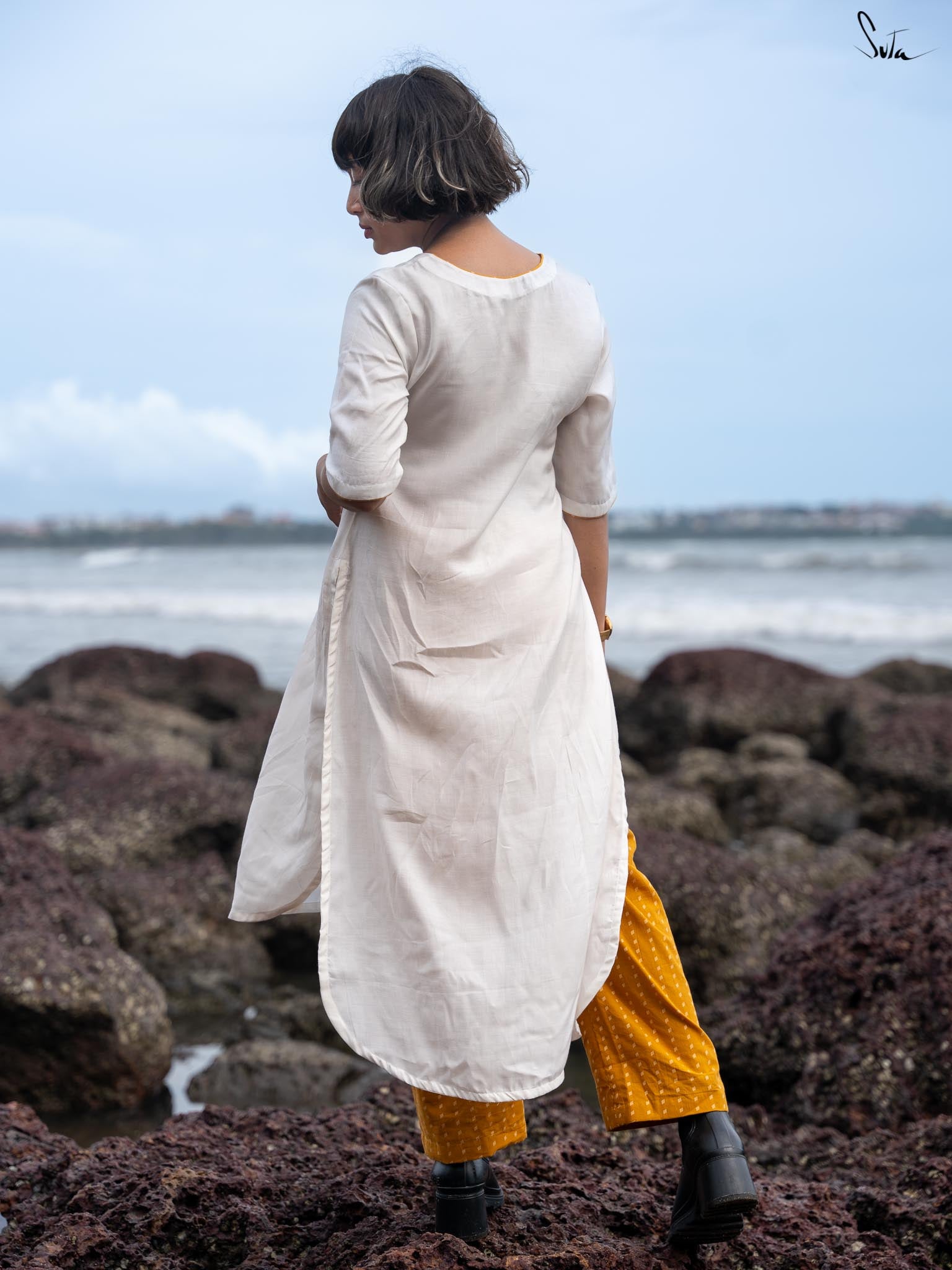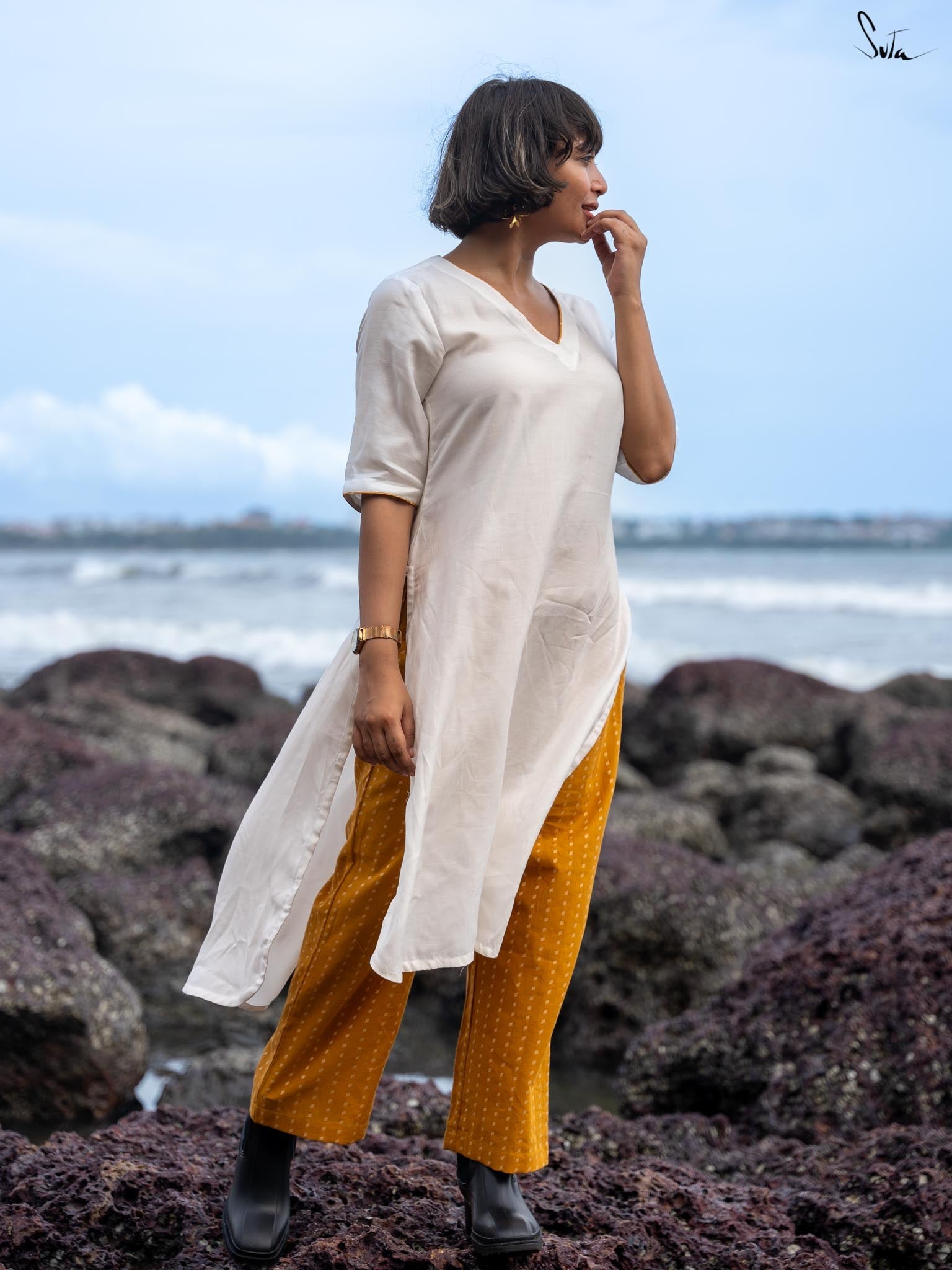 Radiate sunshine vibes with Bright Bliss, a co-ord set that brings together a crisp white top and vibrant yellow striped pants. The V-neckline and pockets add a playful twist. Perfect for casual meet-ups. Style the co-ord set with sneakers and sunnies for a breezy look.