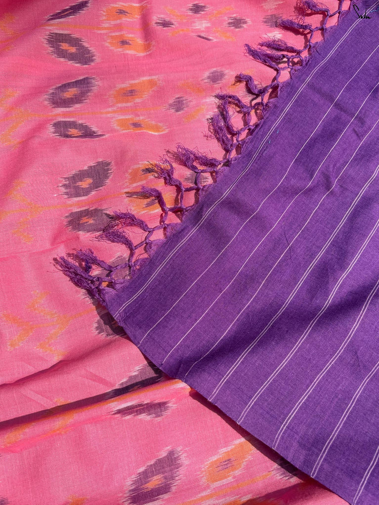 The Twilight Sitara saree is a stunning gray cotton slub piece featuring an elegant zari border and intricate zari stripes that adorn the body. With a contrasting purple selvedge and a magenta pallu embellished with zari checks, this saree beautifully blends sophistication and vibrancy. Perfect for any evening event, drape yourself in this saree and let the twilight inspire your enchanting presence!