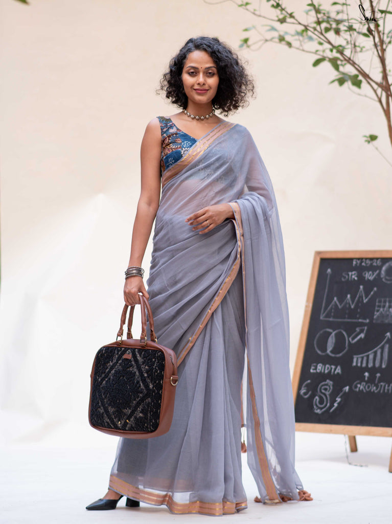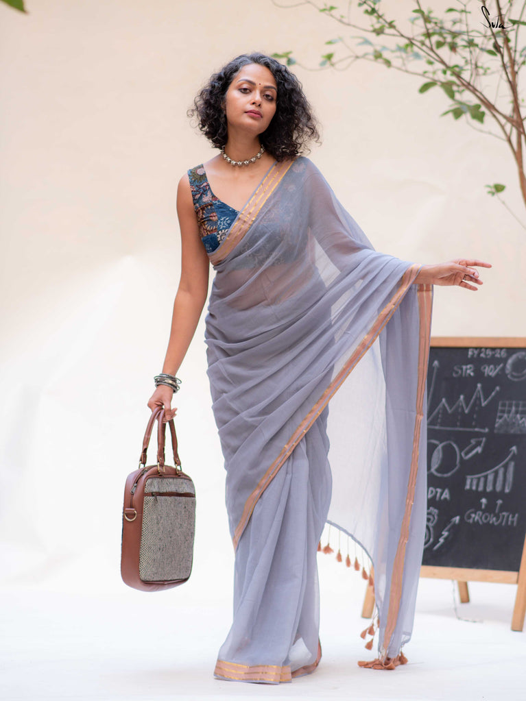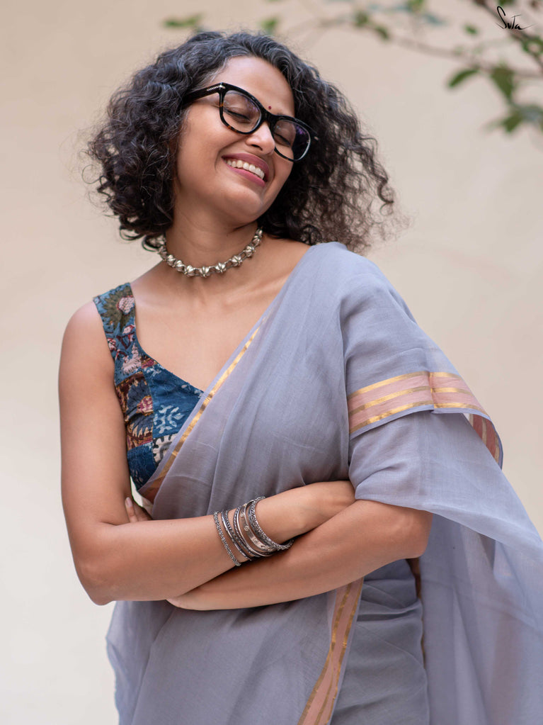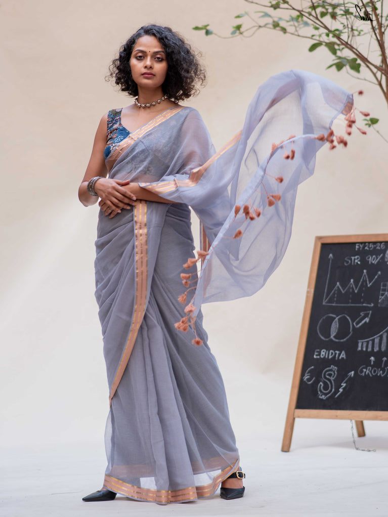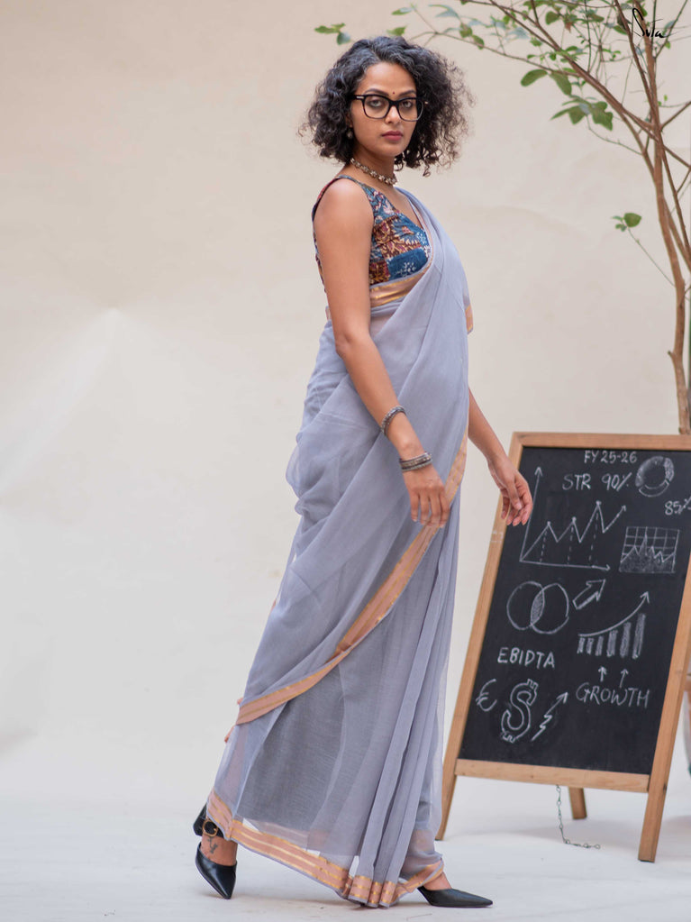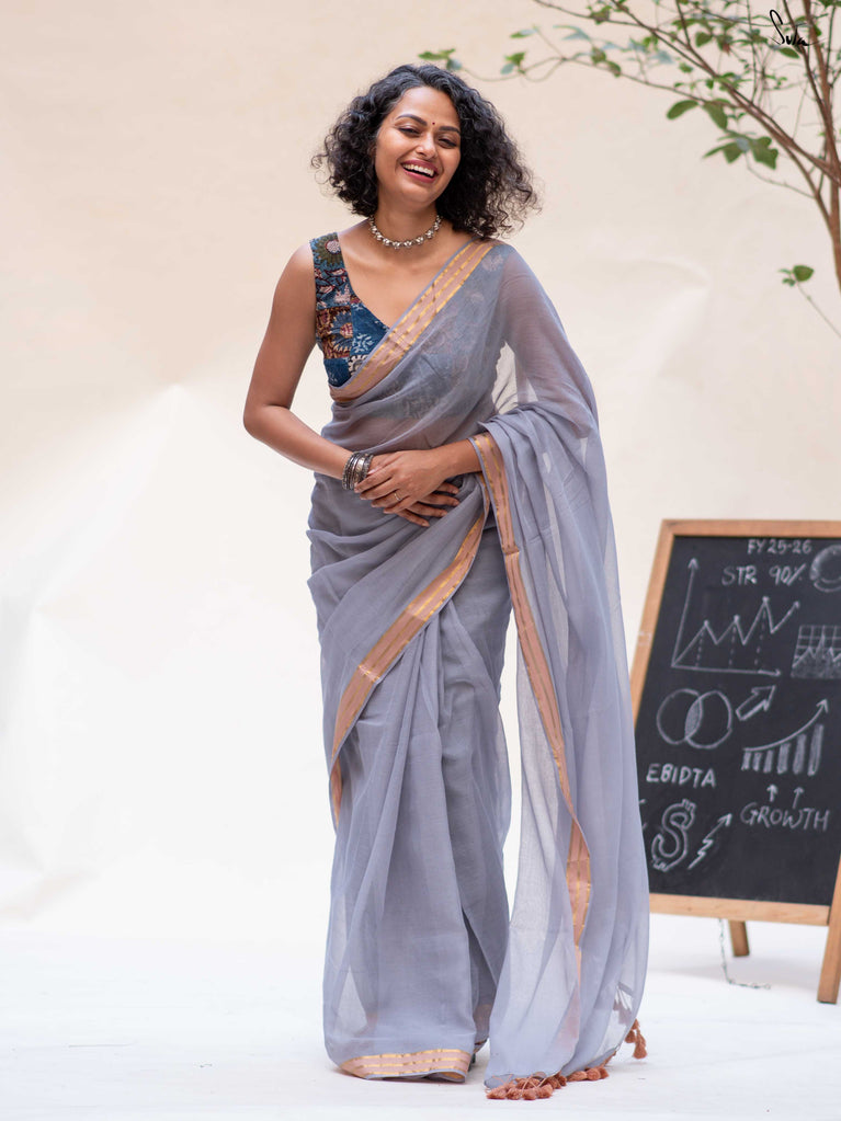 Calm, composed, and quietly elegant - Ash Phool is summer cotton at its most understated. Crafted in soft mul cotton, this bluish grey saree drapes lightly and feels feather-soft on the skin. A classic gold zari border adds a gentle shimmer, keeping the look timeless and refined.Perfect for long days, subtle dressing, and effortless repeats, Ash Phool is comfort with a touch of glow.