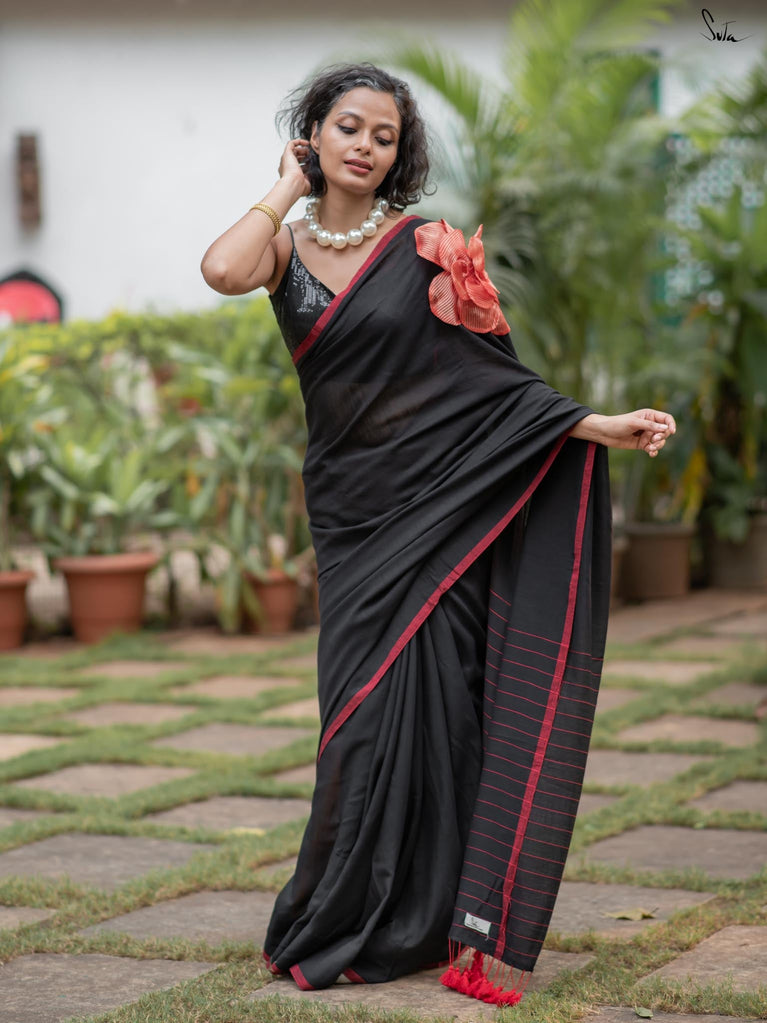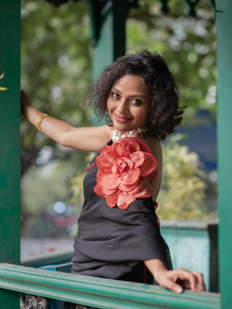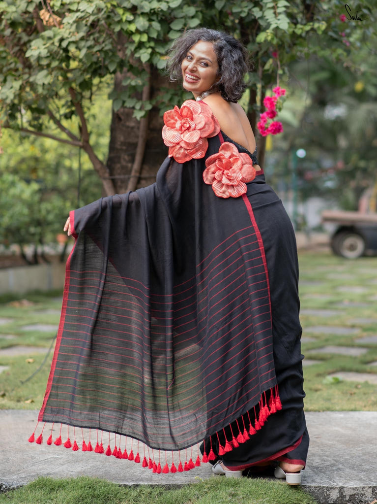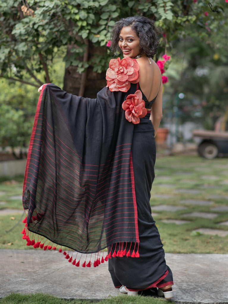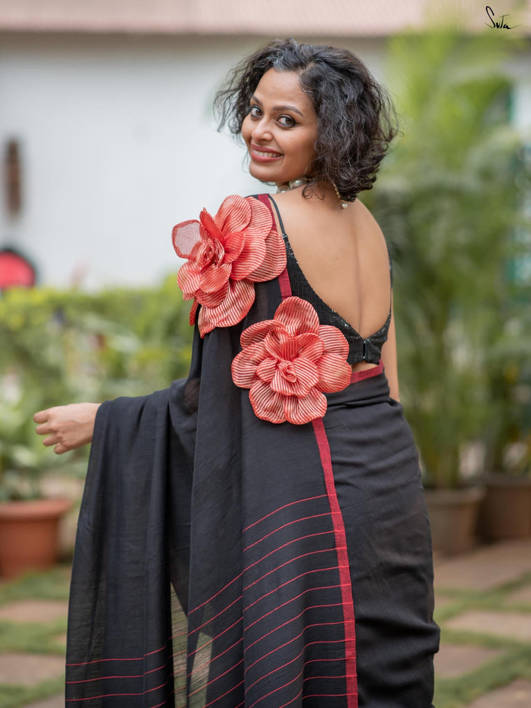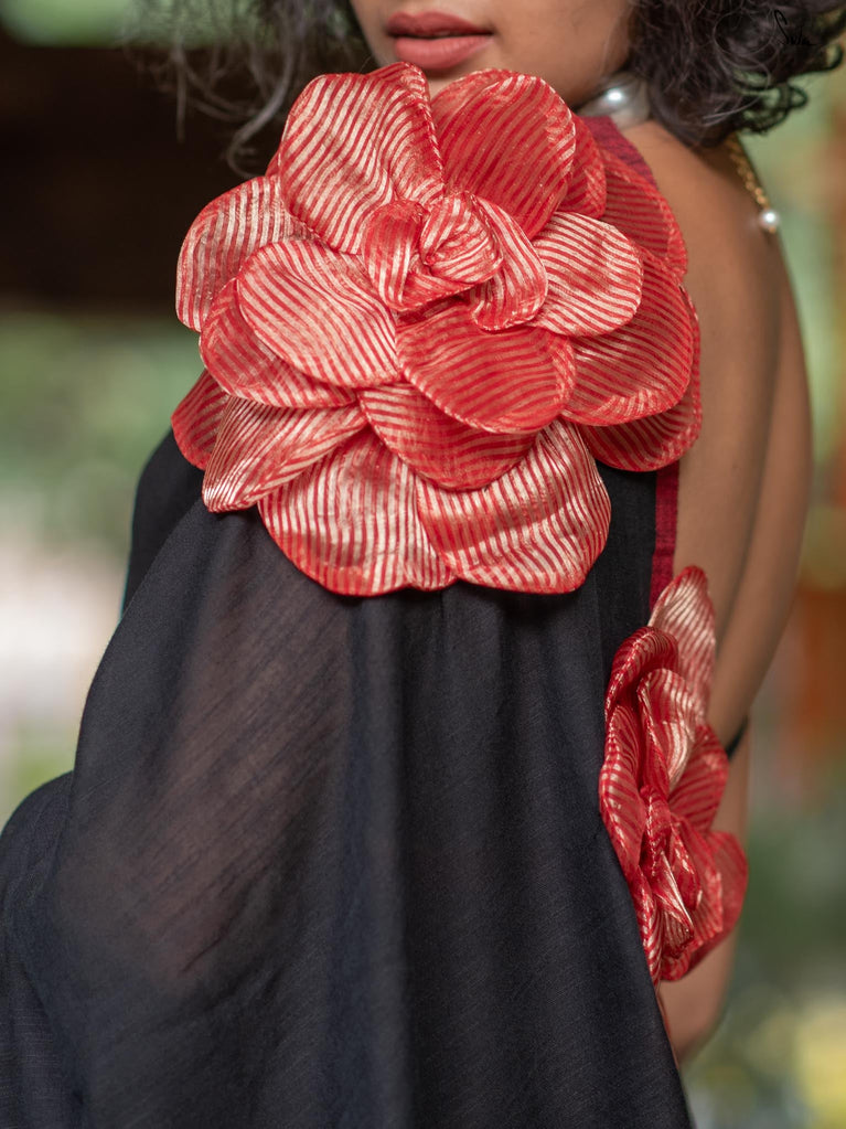A perfect blend of style and elegance, Rosette Rhapsody is a stunning black saree crafted from luxurious Mul-Viscose-Slub. Its delicate red border and exquisite 3D silk tissue flower elevate this saree to pure opulence. Ideal for evening parties, Rosette Rhapsody lets you unleash your inner style queen and make a dazzling entrance wherever you go.
