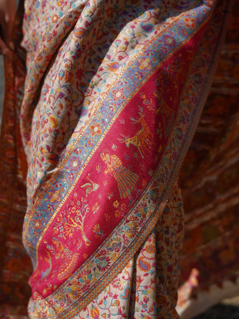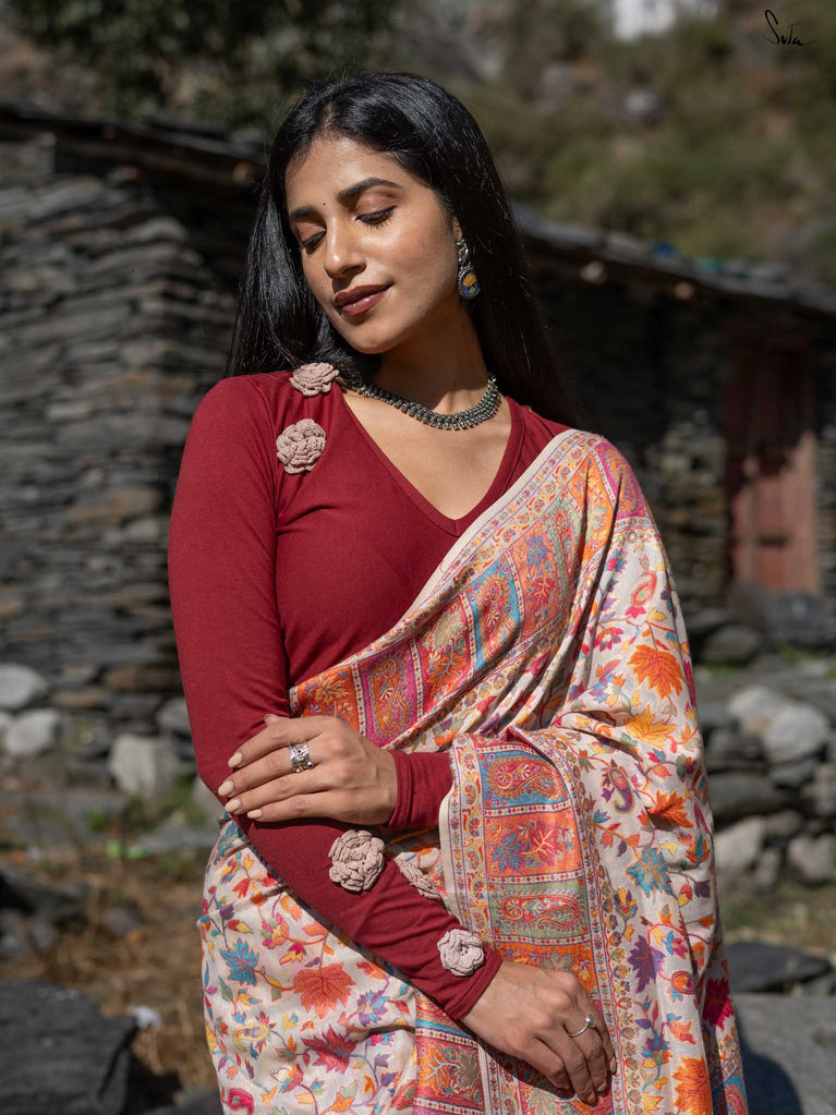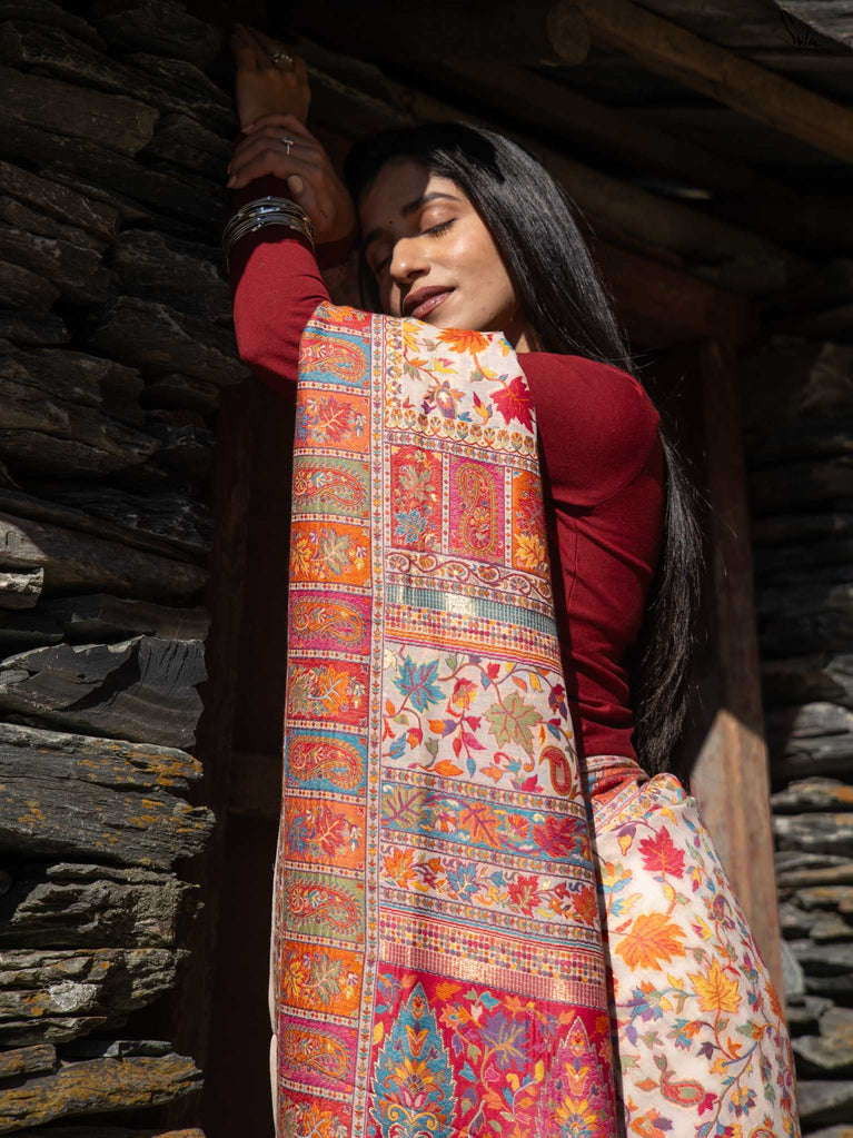 Deodar Pashm takes its inspiration from the Himalayan cedar-strong, rooted, and serene. Made from a soft blend of pashmina wool and silk blend, it feels like warm light on skin.The beige base reflects the quiet beauty of earth, while colourful woven motifs bloom like wildflowers after rain. Graceful and grounded, Deodar Pashm is perfect for the woman who carries quiet strength and endless elegance.