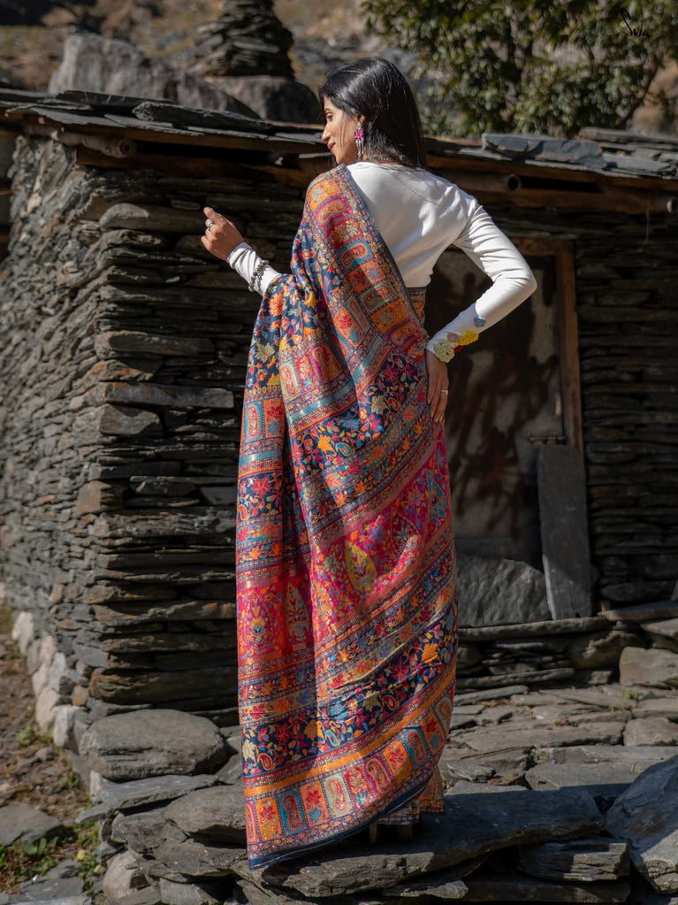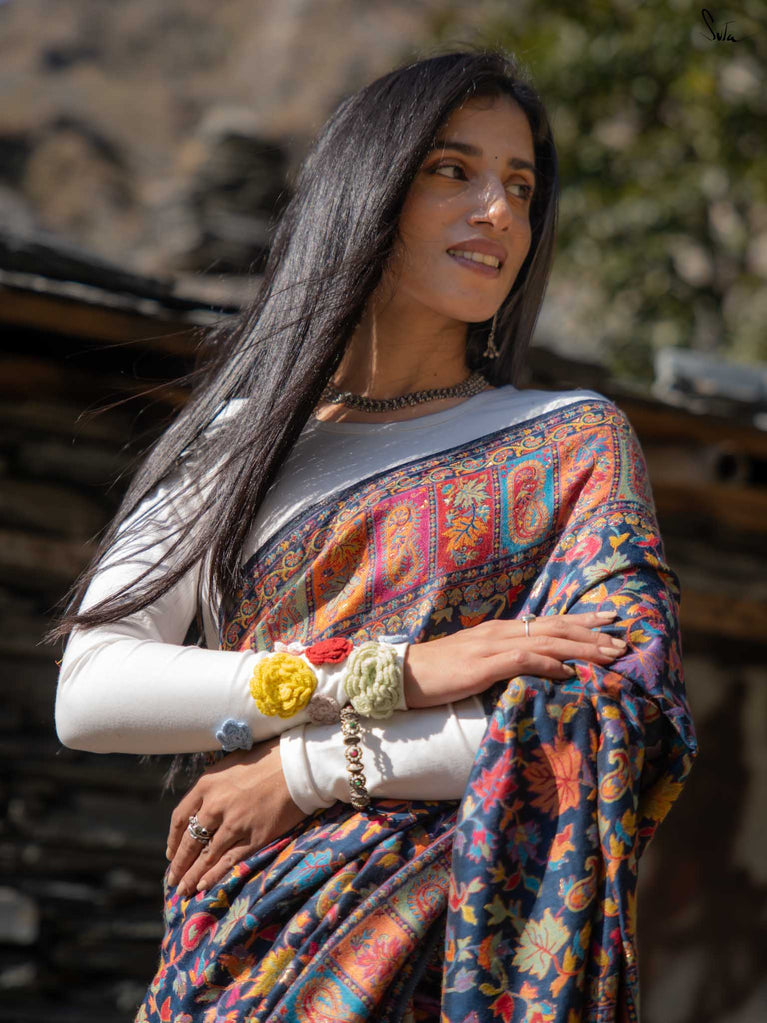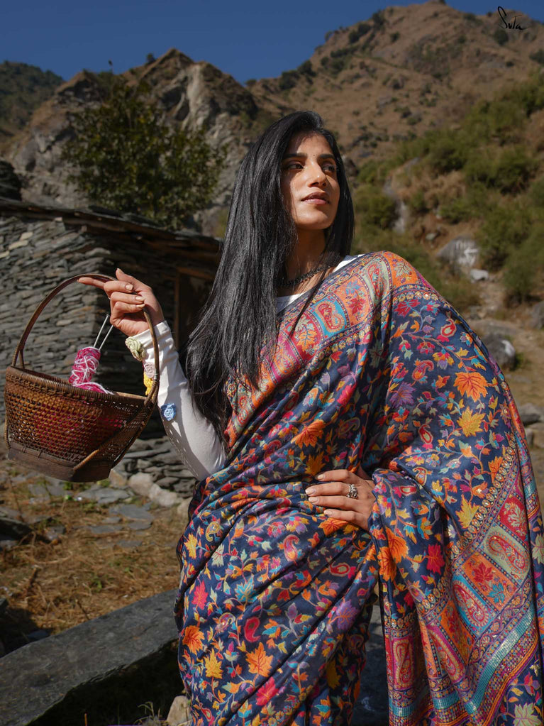 Apricot Pashm feels like apricot flowers opening under a twilight sky. Woven from a soft blend of pashmina wool and silk blend, it’s light, fluid, and effortless to wear.The deep blue base shines with colourful woven motifs, inspired by Kashmiri artistry and serene mountain evenings. Warm, elegant, and easy this saree blends tradition with modern charm.Made for the woman who seeks beauty in softness, Apricot Pashm brings strength wrapped in grace.