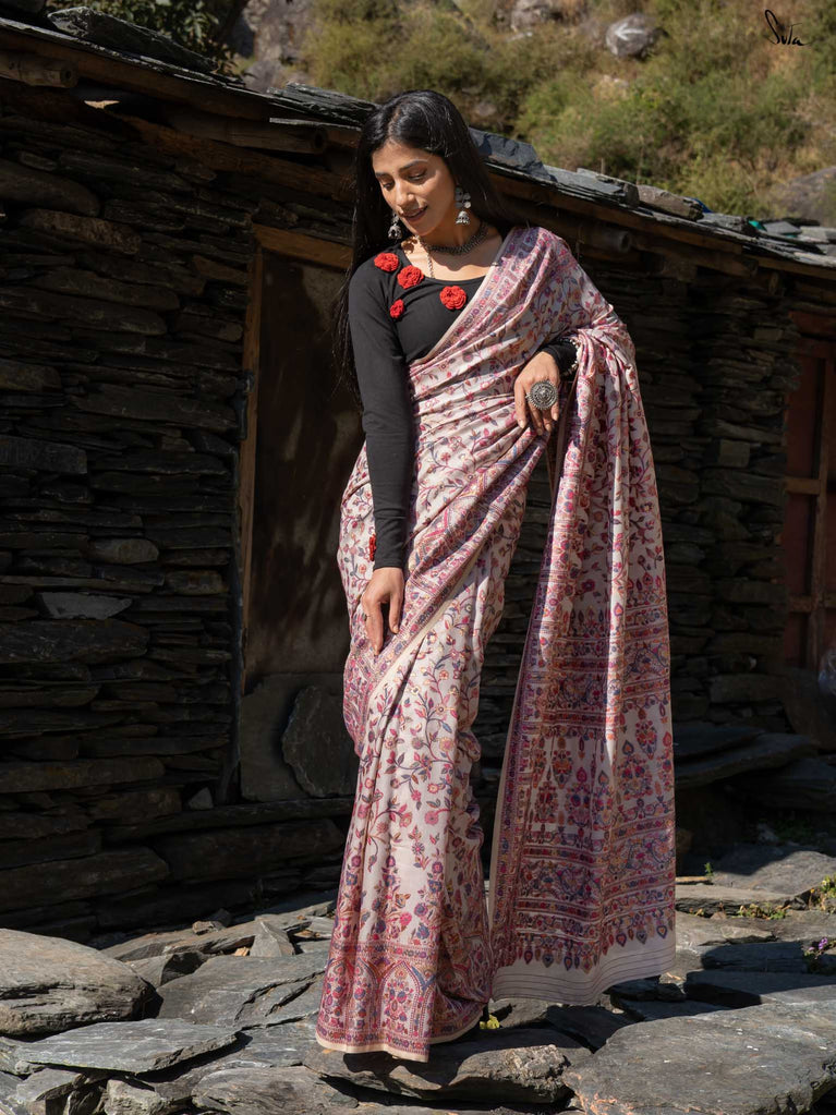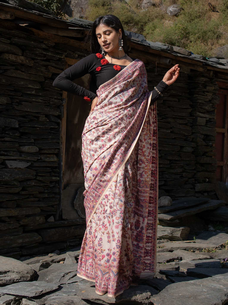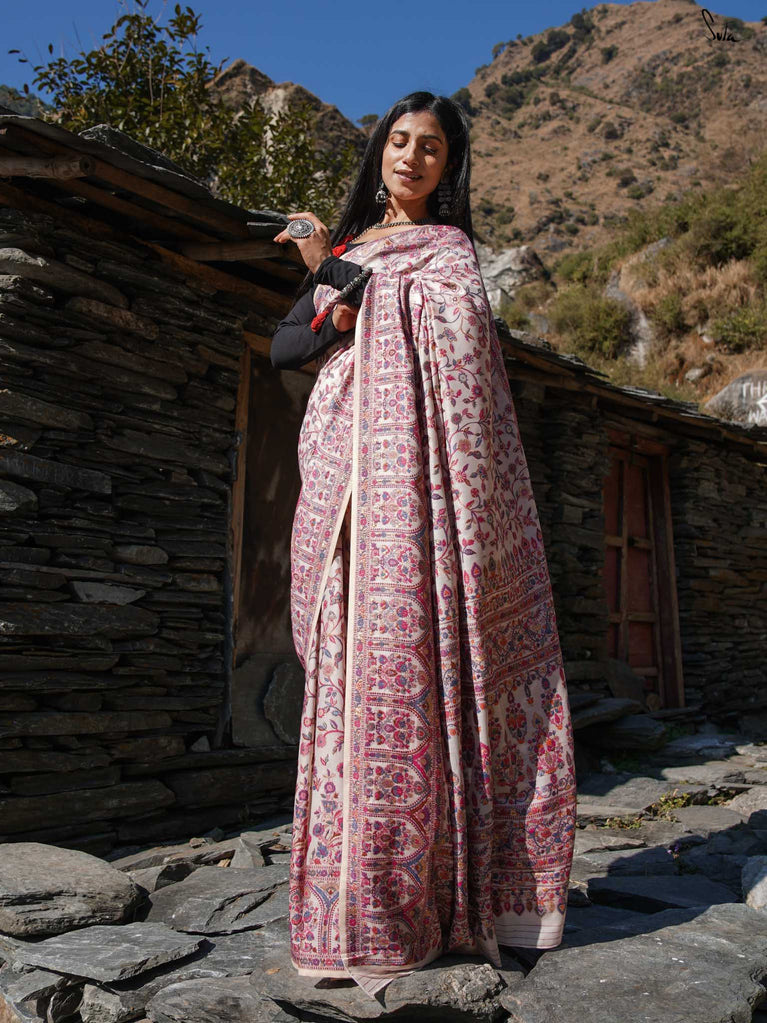 Willow Pashm is as graceful as a willow tree by a quiet stream. Made from a blend of pashmina wool and silk blend, it's warm yet light, rooted in tradition yet easy to wear.The off-white base is brought to life with colourful woven motifs, like flowers blooming in the valleys. Soft, calm, and quietly radiant -this saree captures the peaceful beauty of the Himalayas.Perfect for moments that call for gentle elegance, Willow Pashm is all about effortless grace.