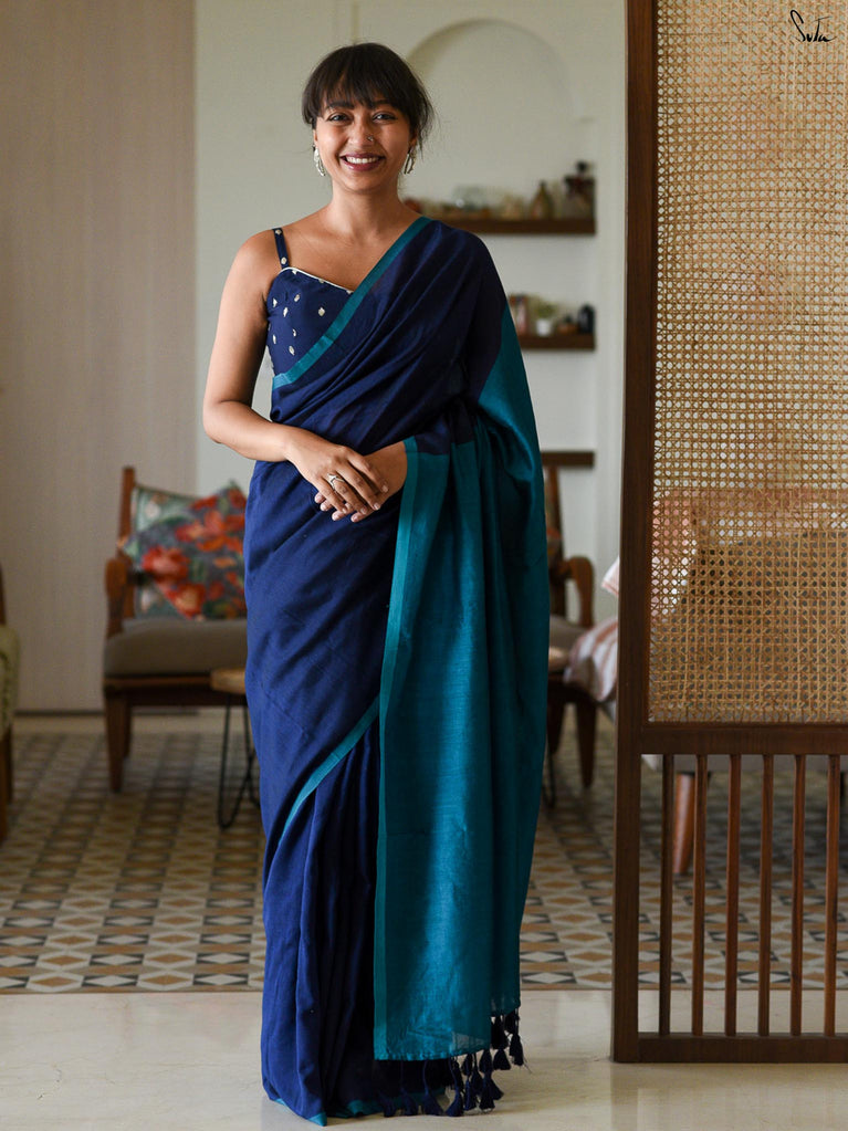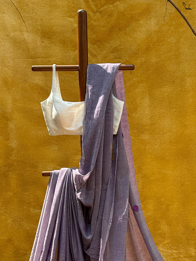 A fresh blue base saree designed for easy, everyday wear. Made from a soft cotton-linen blend, this saree is breathable, lightweight, and comfortable enough to carry through long workdays.The saree features digital floral prints inspired by fuchsia flowers, adding a soft contrast to the blue base. Delicate pink lace detailing along the border brings in a subtle pop of colour, keeping the look balanced and wearable.Ideal for office wear, casual meetings, or everyday outings when you want something simple yet polished.