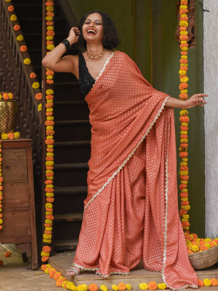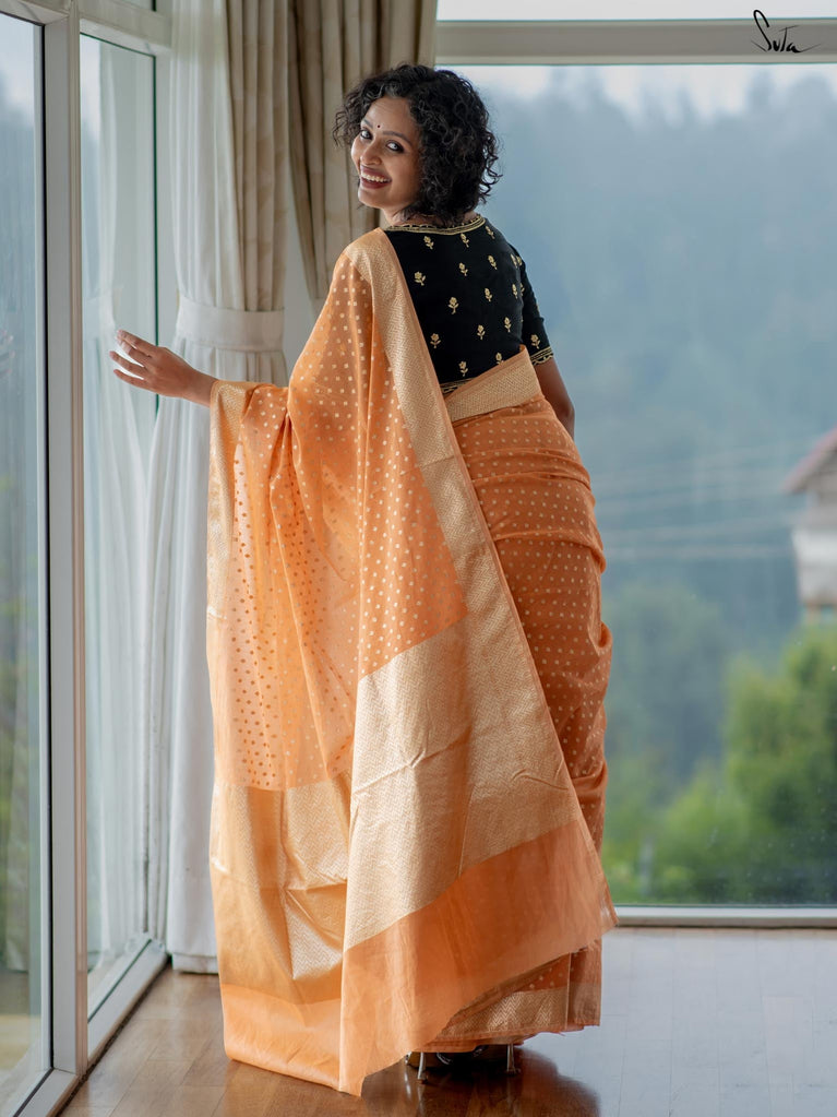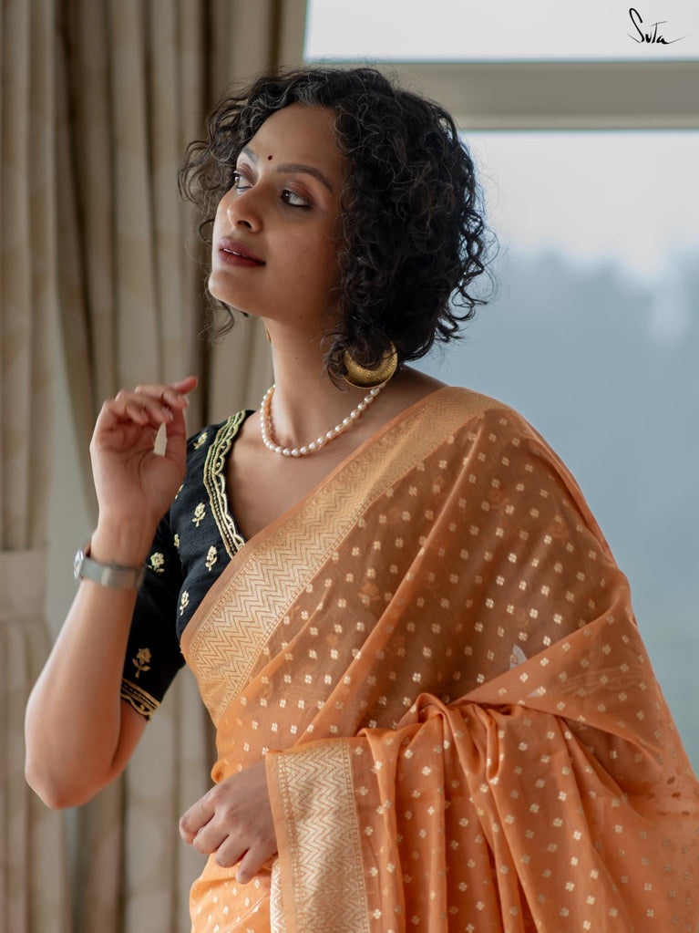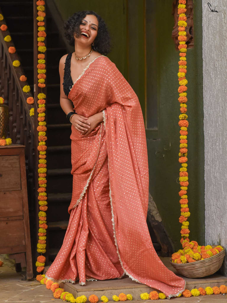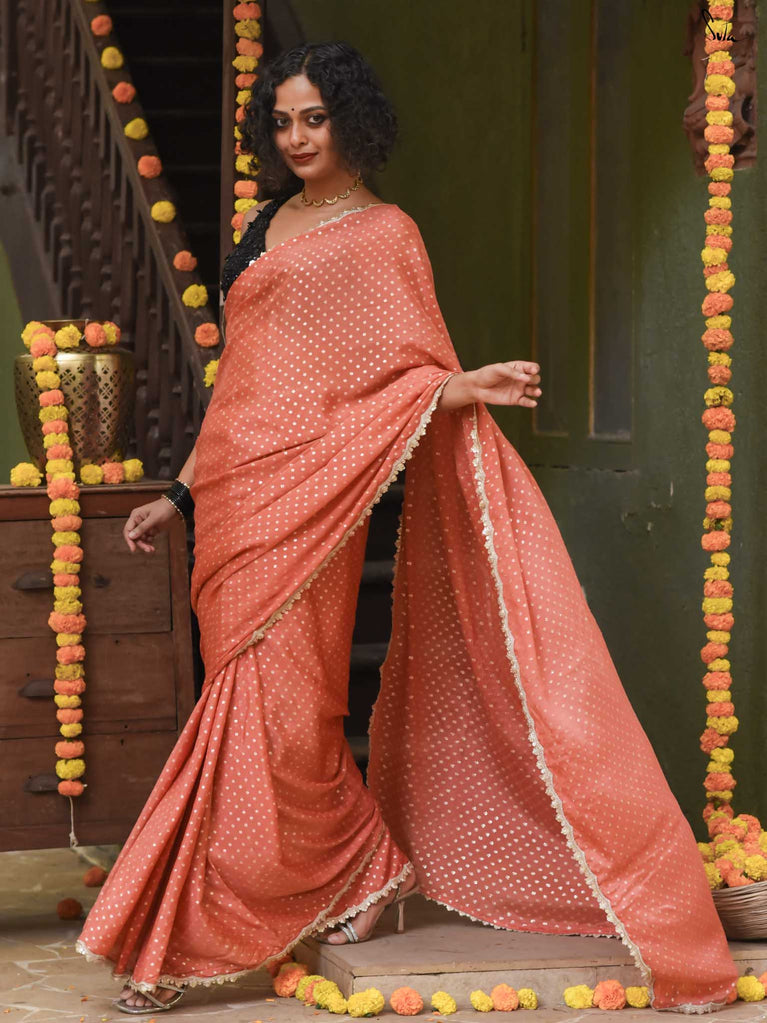 Soft, soothing, and effortlessly elegant - this peach viscose-blend saree is made for those who love understated festive charm. The fluid drape is detailed with light gold woven buttis that catch the light in a subtle, refined way. The embroidered scallop lace along the edges adds a graceful finish, making this saree perfect for intimate weddings, pre-wedding dinners, and evening celebrations.