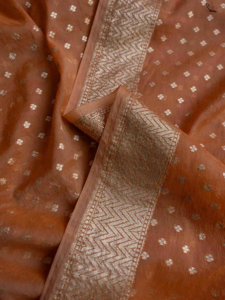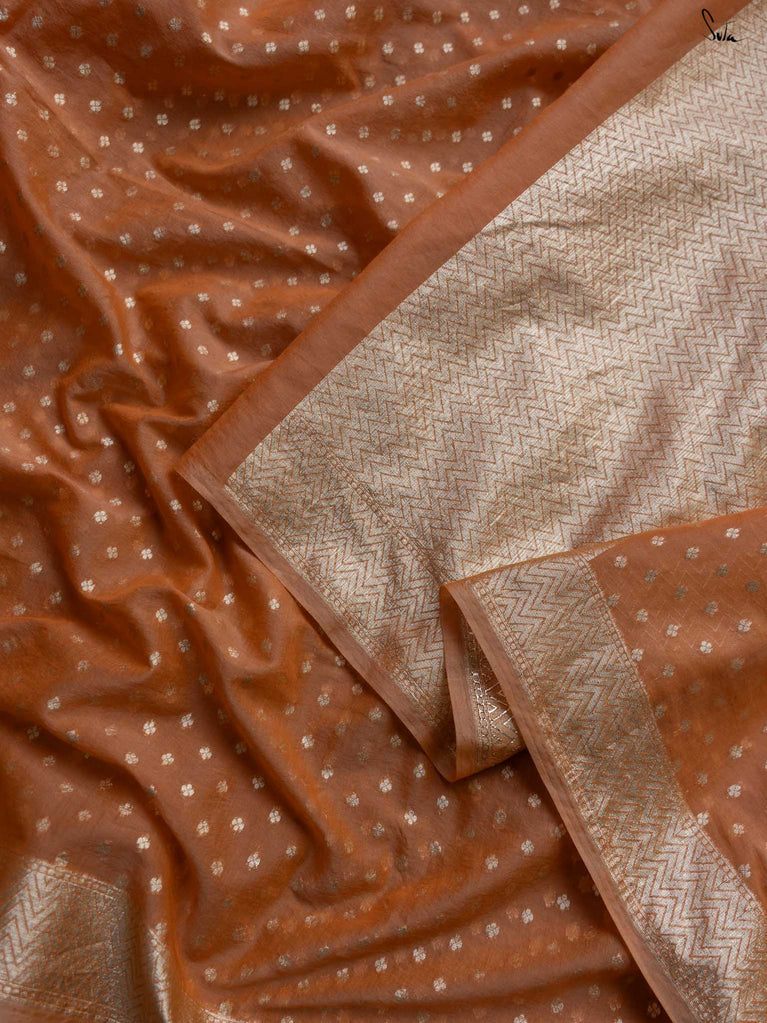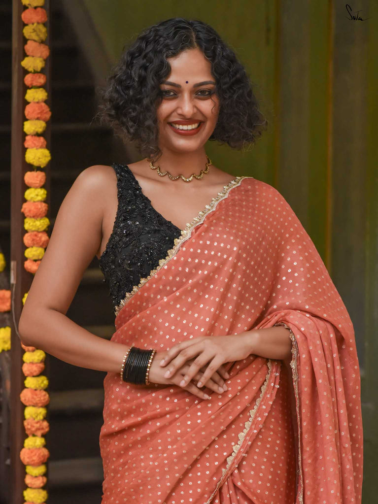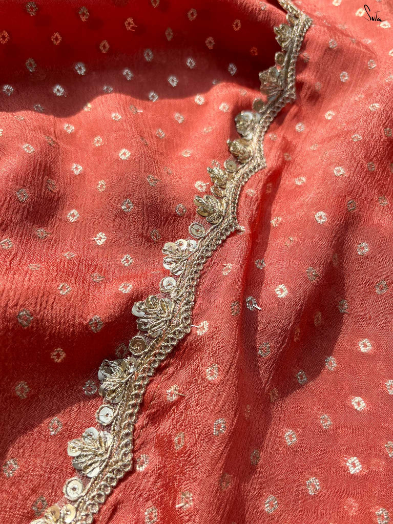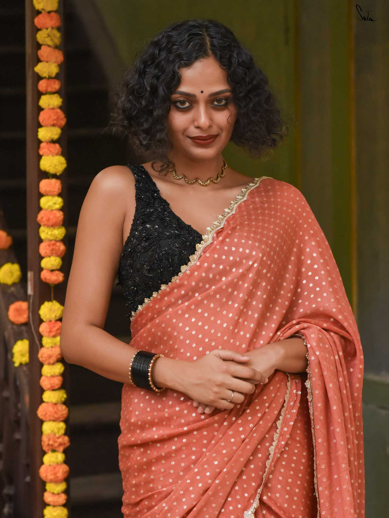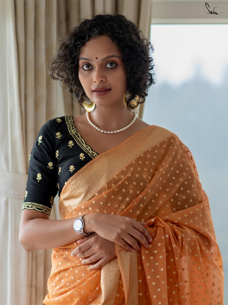Soft, soothing, and effortlessly elegant - this peach viscose-blend saree is made for those who love understated festive charm. The fluid drape is detailed with light gold woven buttis that catch the light in a subtle, refined way. The embroidered scallop lace along the edges adds a graceful finish, making this saree perfect for intimate weddings, pre-wedding dinners, and evening celebrations.