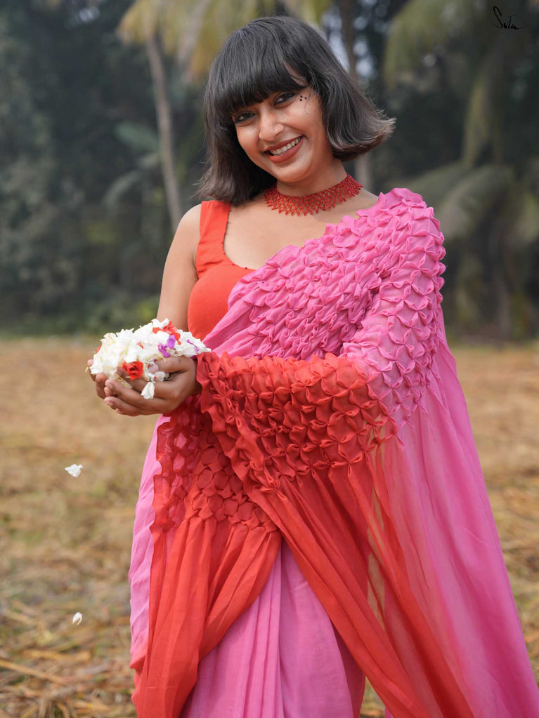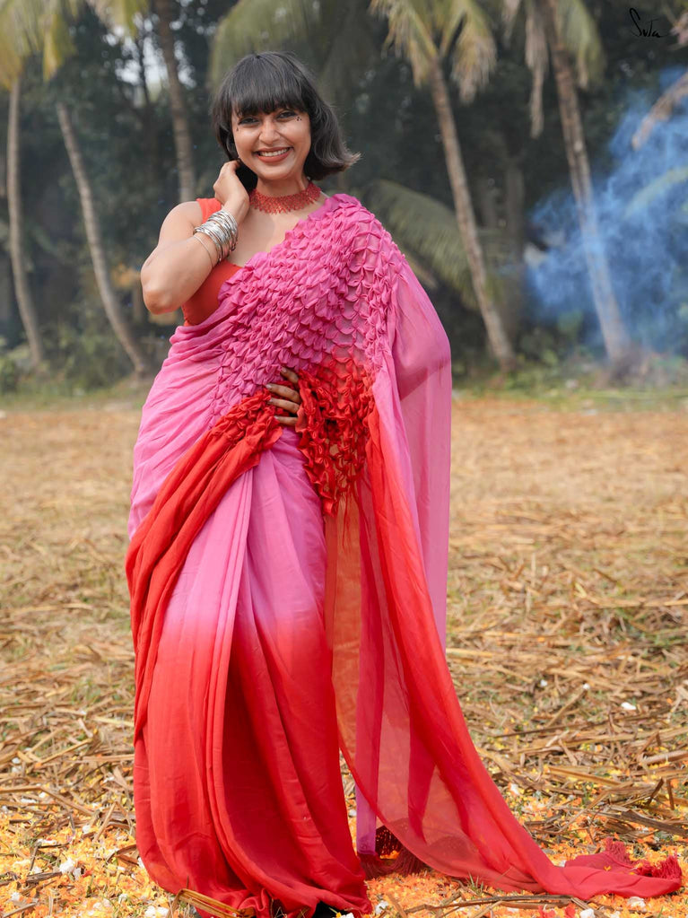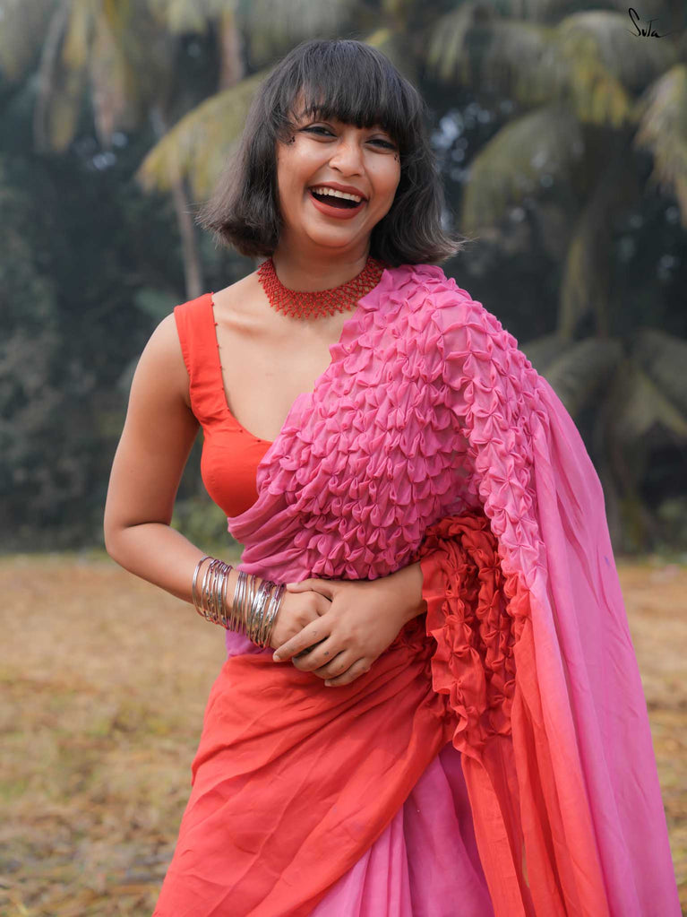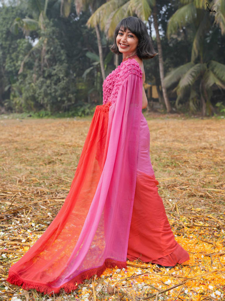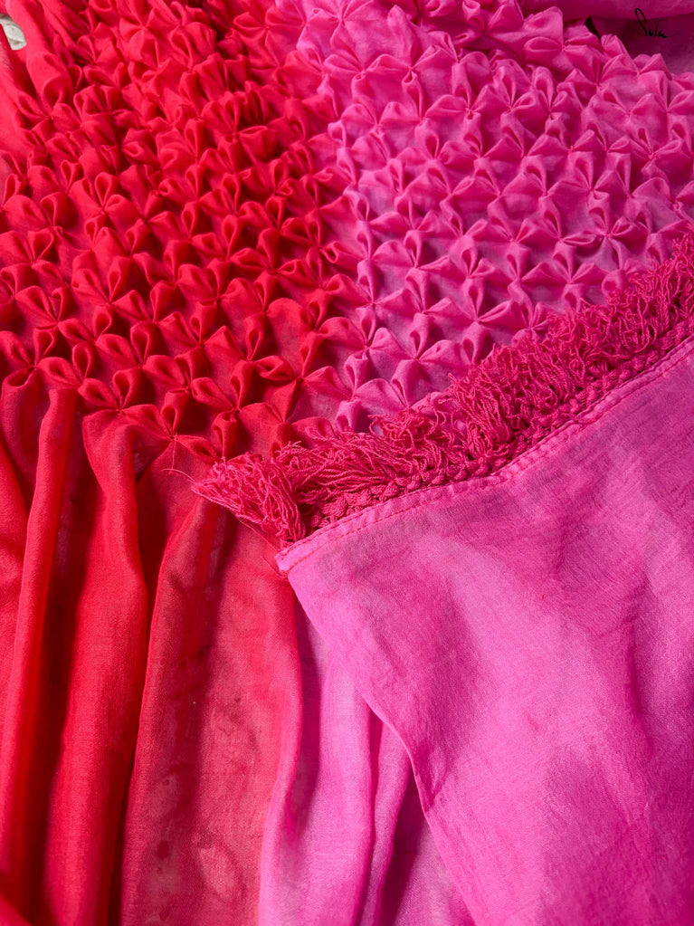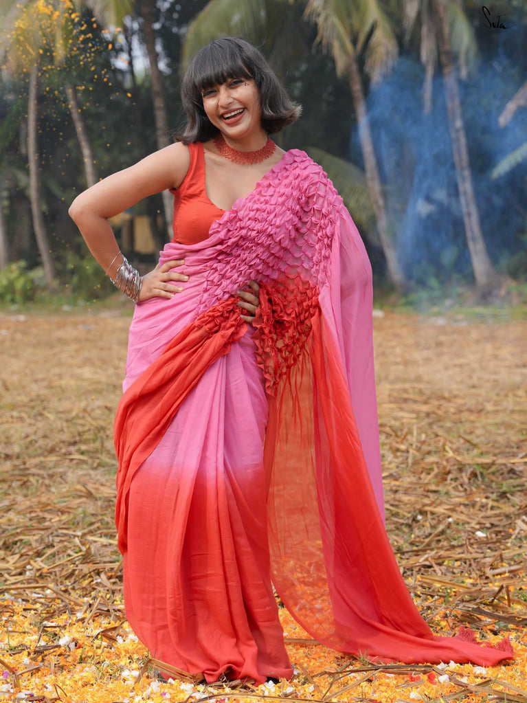 As vibrant and radiant as the festival itself, this red and pink ombre tie-dye mul modal saree is an explosion of color and joy. The tie-dye swirls like a splash of gulaal in the air, capturing the spirit of Holi with every turn. The intricate smocking technique weaves a story of festivity, while the jhalar tassels bring the essence of playfulness into the fabric. This saree isn’t just worn, it’s experienced, like a dance of colors that never ends.