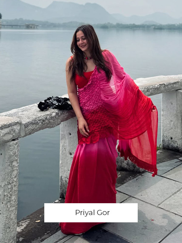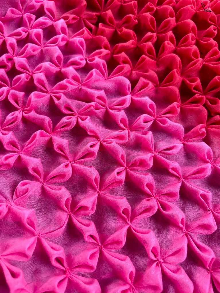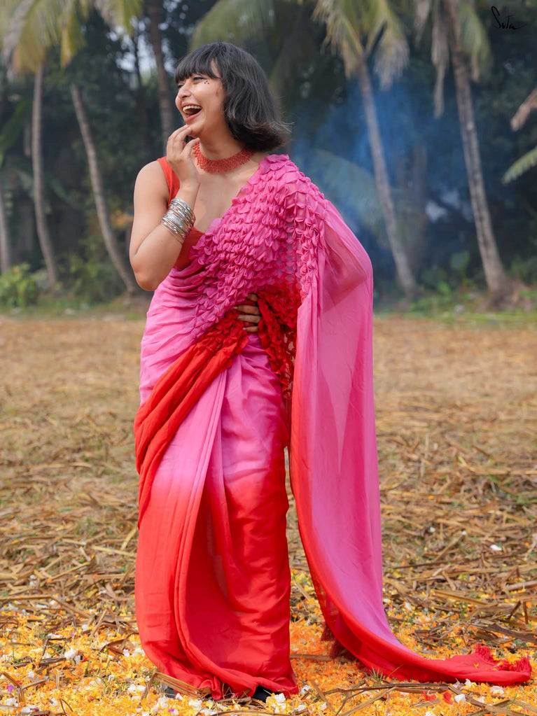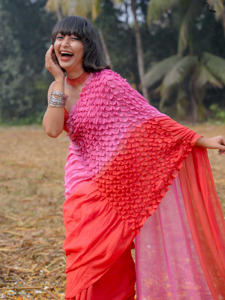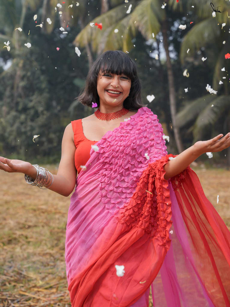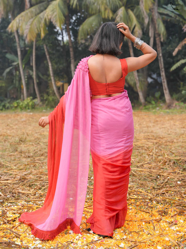 As vibrant and radiant as the festival itself, this red and pink ombre tie-dye mul modal saree is an explosion of color and joy. The tie-dye swirls like a splash of gulaal in the air, capturing the spirit of Holi with every turn. The intricate smocking technique weaves a story of festivity, while the jhalar tassels bring the essence of playfulness into the fabric. This saree isn’t just worn, it’s experienced, like a dance of colors that never ends.