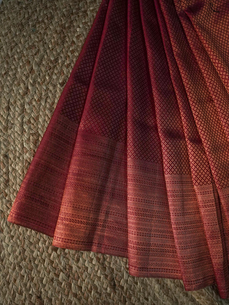 Anvika, a 100% silk Kanjivaram in pink unfolds like the delicate petals of festive blooms. Its intricate zari work and metallic tassels reflect the beauty of nature’s simplicity. Perfect for creating memories and embracing joy, it comes with a matching blouse piece for a complete, radiant look.