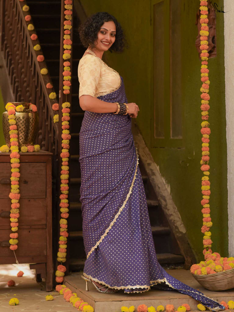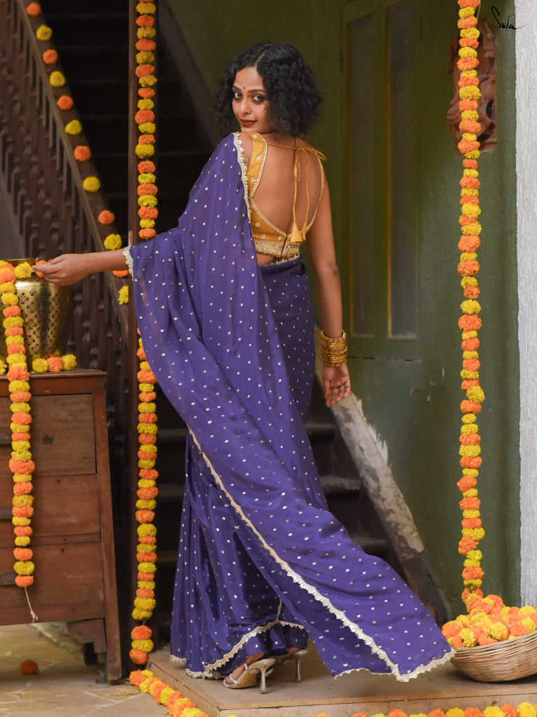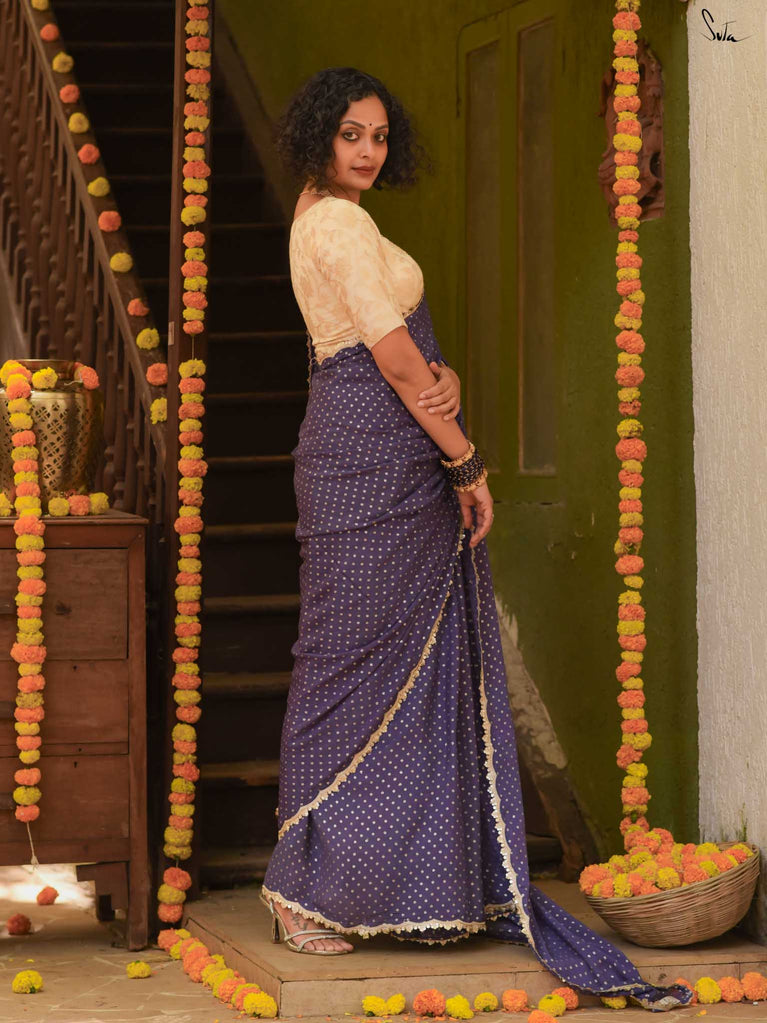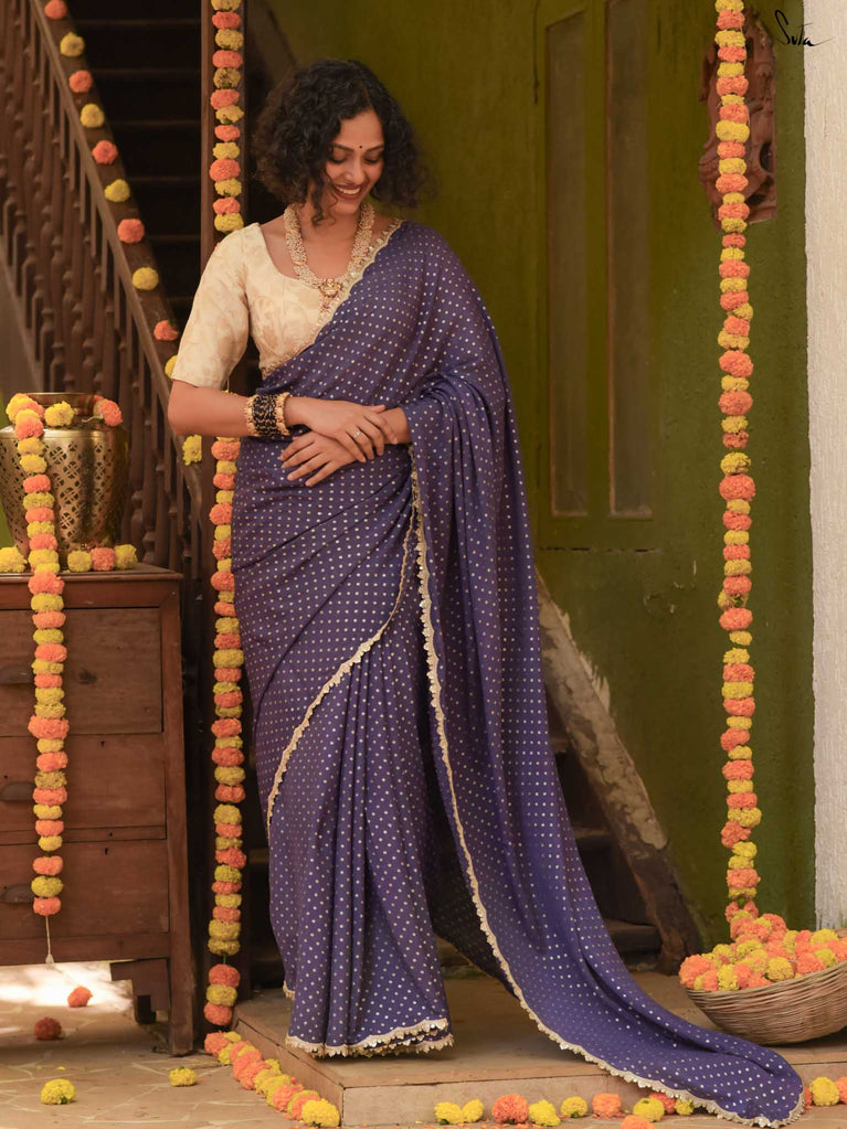 Deep, refined, and effortless - this navy blue viscose-blend saree brings a rich elegance to every occasion. The smooth, fluid drape is dotted with light gold woven buttis, adding a soft glow against the dark base. Finished with an embroidered scallop lace, it carries a polished, timeless charm perfect for evening weddings, receptions, and celebratory gatherings.