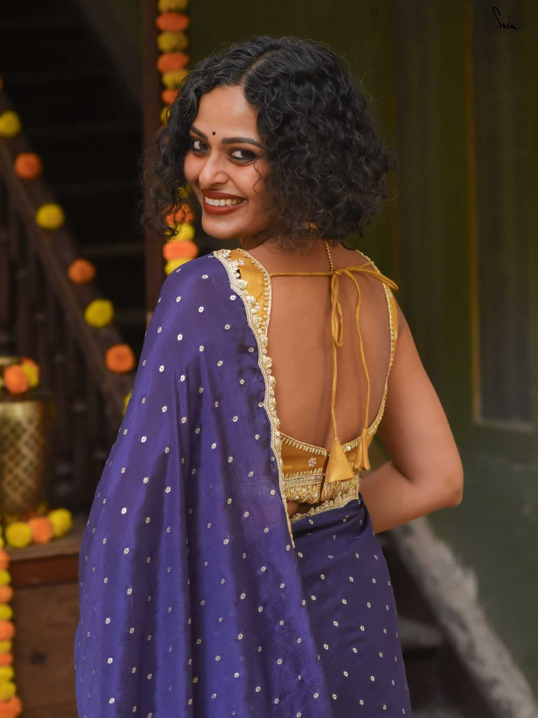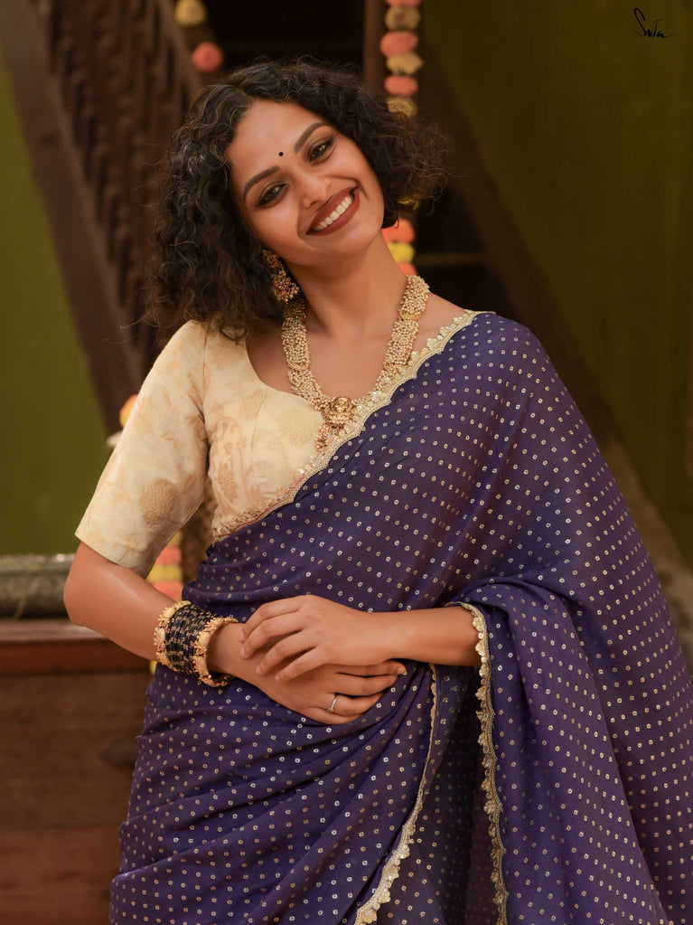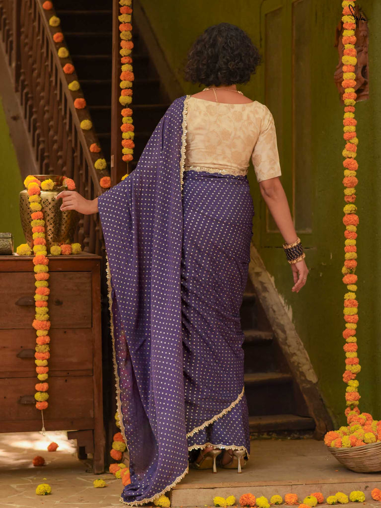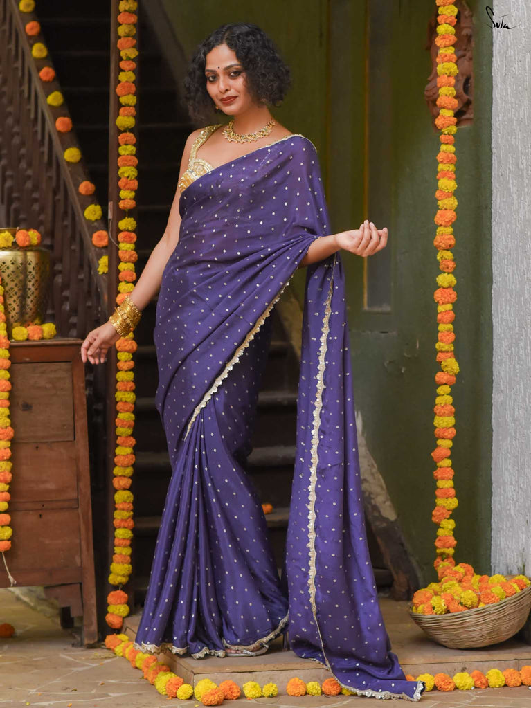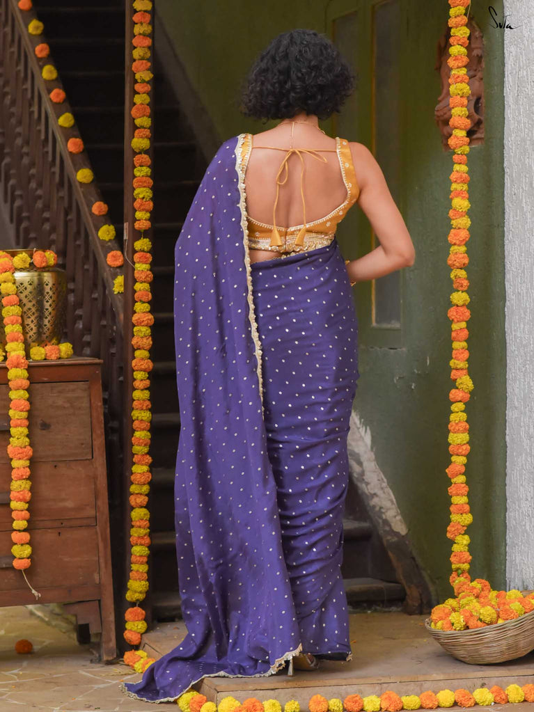Deep, refined, and effortless - this navy blue viscose-blend saree brings a rich elegance to every occasion. The smooth, fluid drape is dotted with light gold woven buttis, adding a soft glow against the dark base. Finished with an embroidered scallop lace, it carries a polished, timeless charm perfect for evening weddings, receptions, and celebratory gatherings.