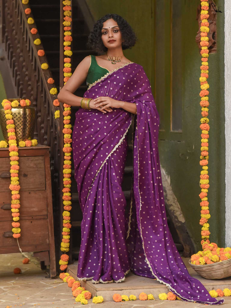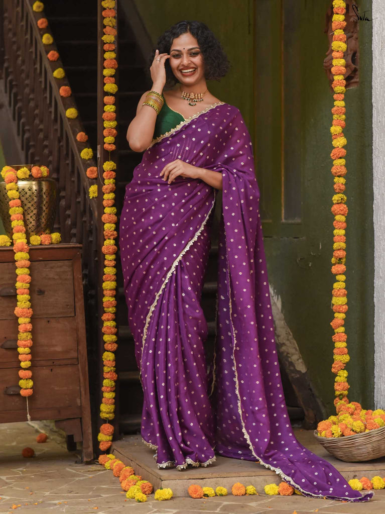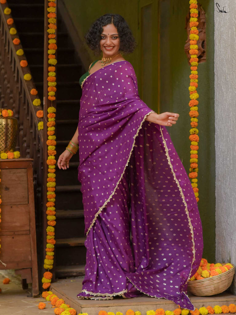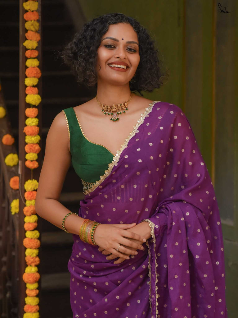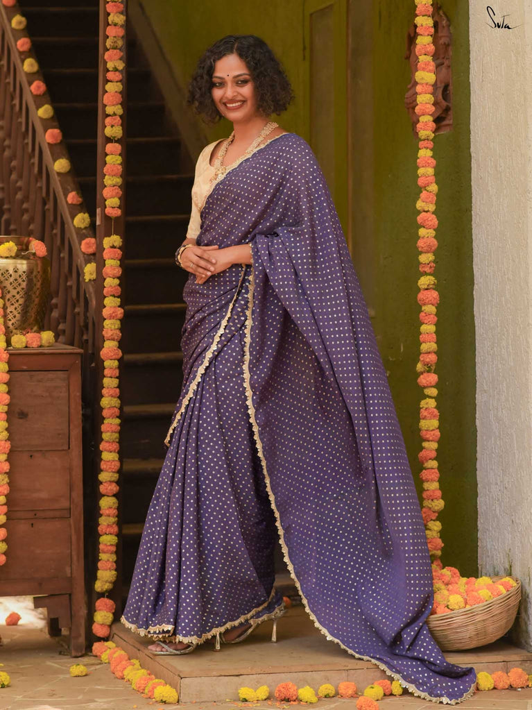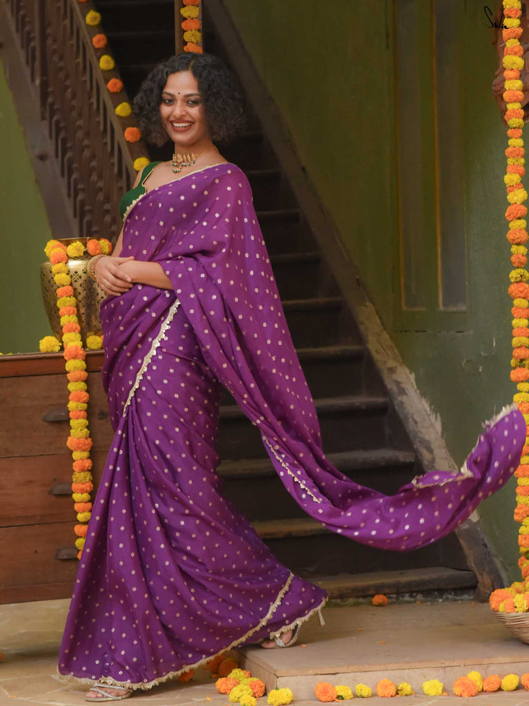 Rich & striking - this purple viscose-blend saree brings depth and elegance to every celebration. The smooth drape is adorned with light gold woven buttis that add a soft, luminous sparkle. Finished with an embroidered scallop lace, it carries a refined yet celebratory feel, perfect for evening weddings, receptions, and special family events.