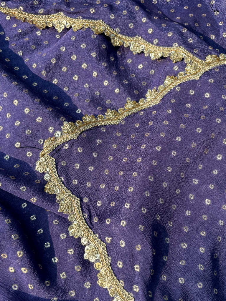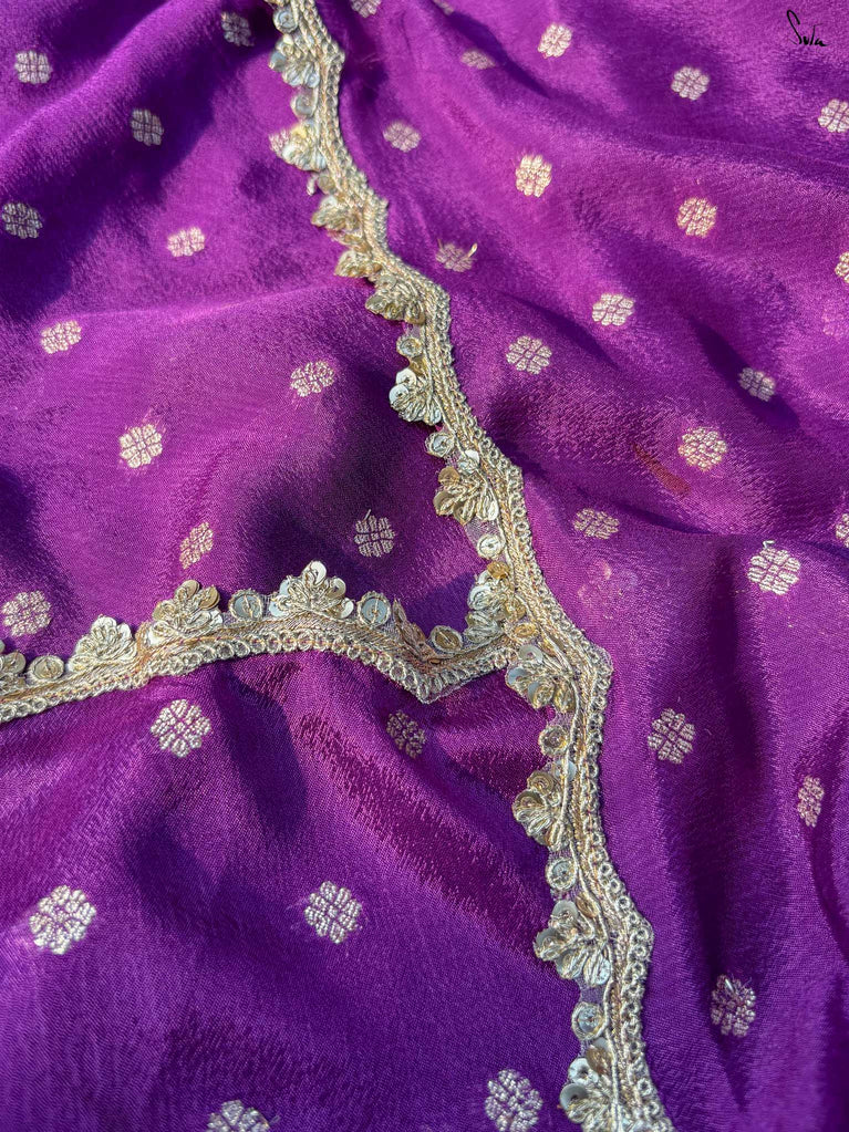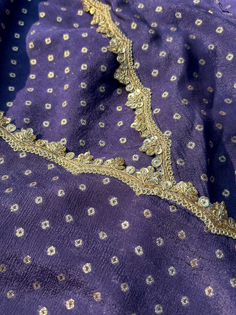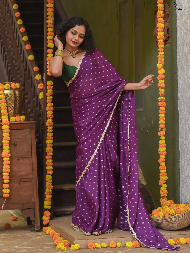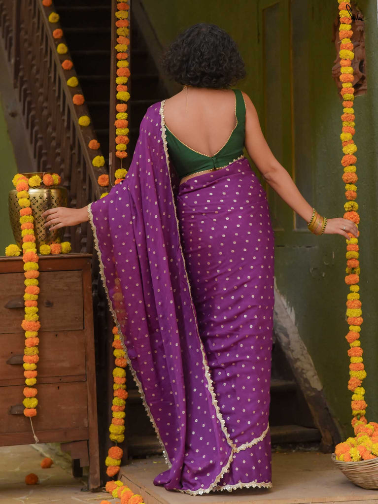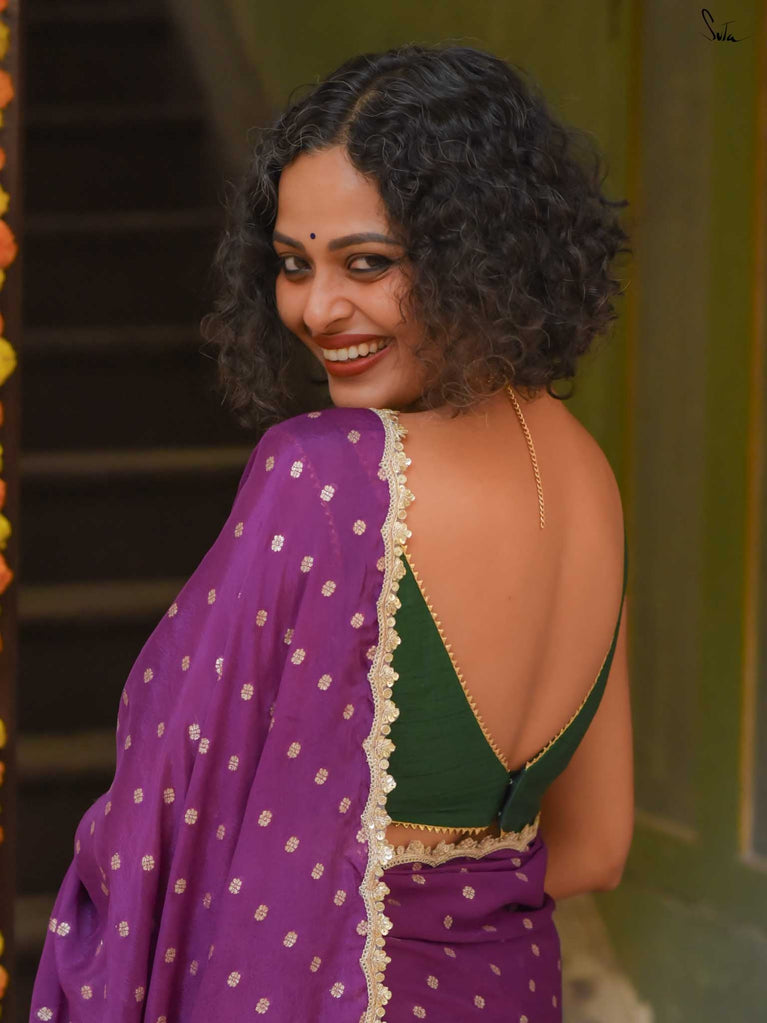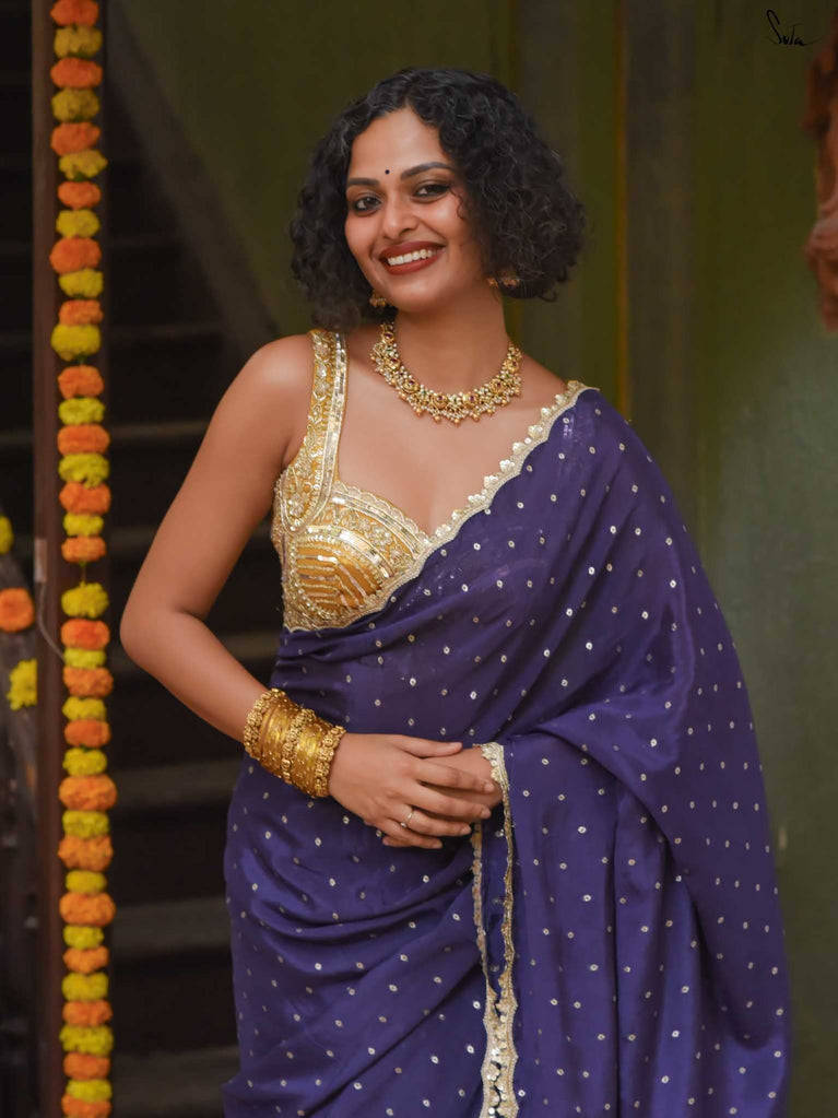 Rich & striking - this purple viscose-blend saree brings depth and elegance to every celebration. The smooth drape is adorned with light gold woven buttis that add a soft, luminous sparkle. Finished with an embroidered scallop lace, it carries a refined yet celebratory feel, perfect for evening weddings, receptions, and special family events.