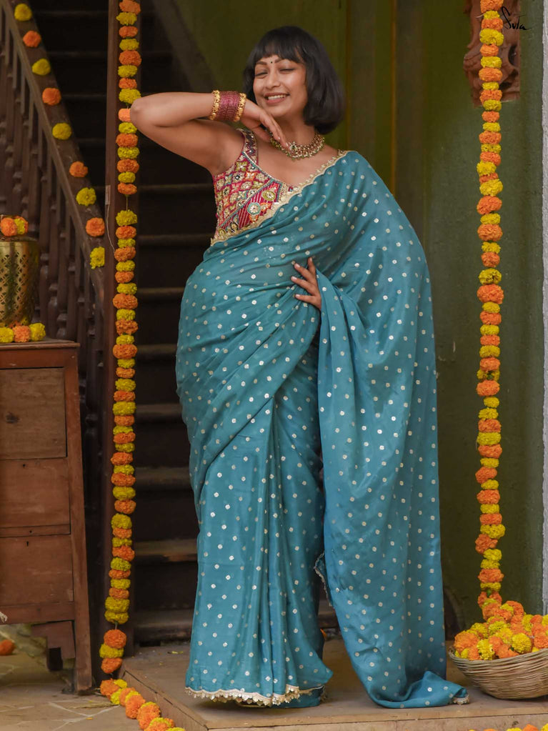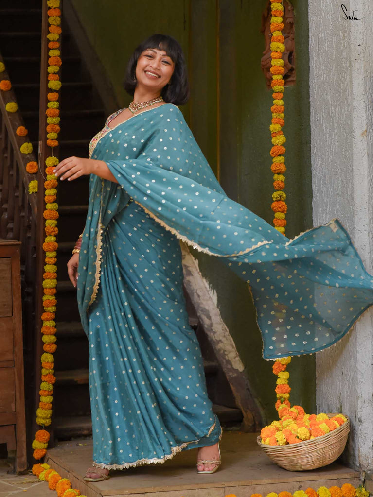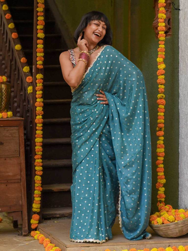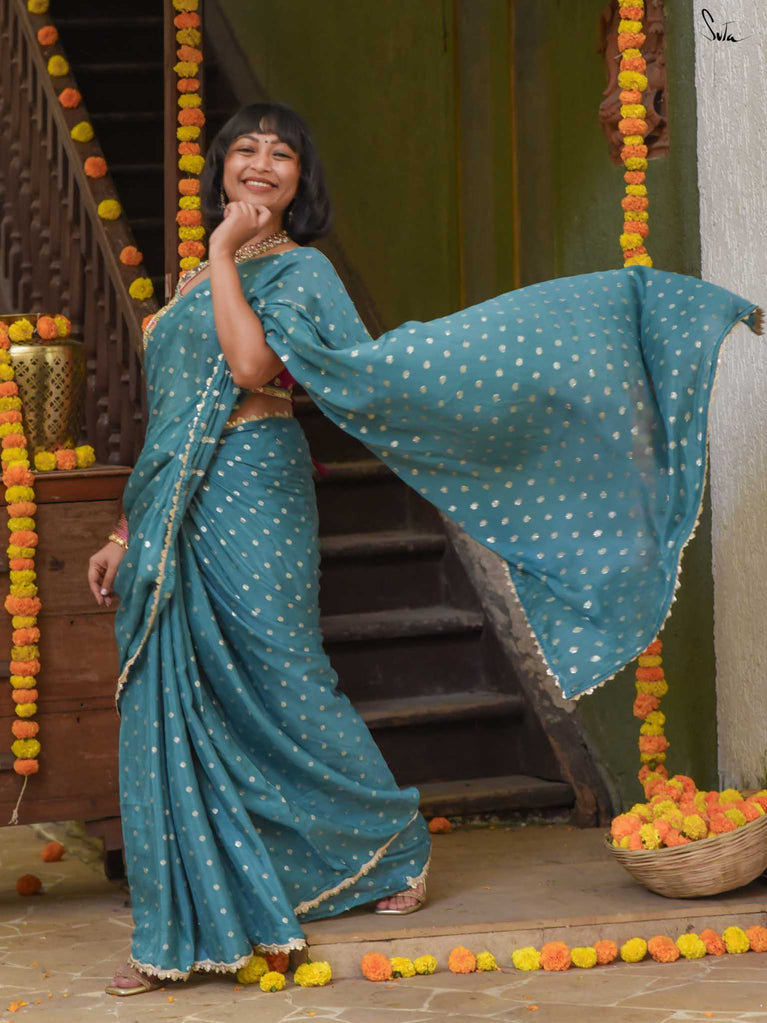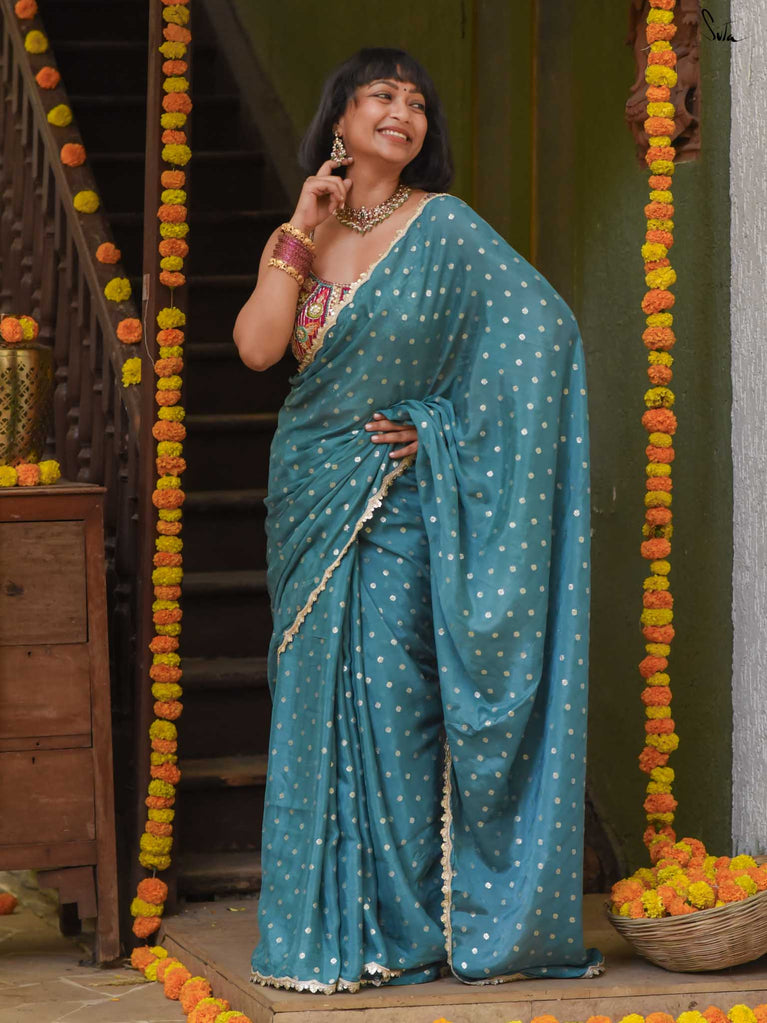 Striking, graceful, and full of charm - this teal viscose-blend saree is designed to stand out beautifully in any celebration. The soft, fluid drape is adorned with light gold woven buttis, adding a subtle shimmer that plays gently with movement. Finished with an embroidered scallop lace, it carries an elegant touch perfect for weddings, sangeet evenings, and joyful family gatherings.