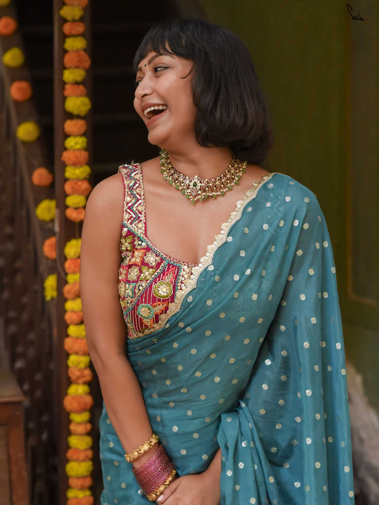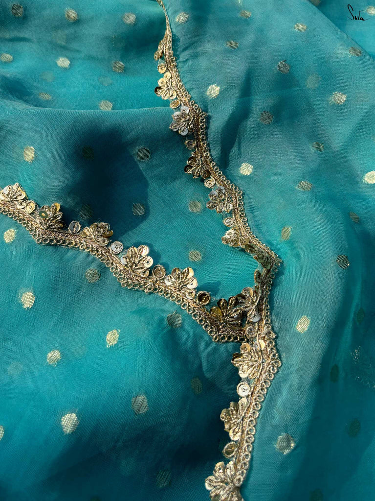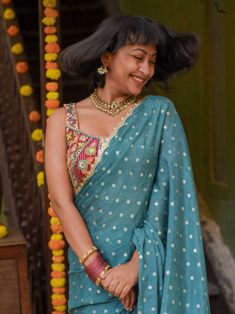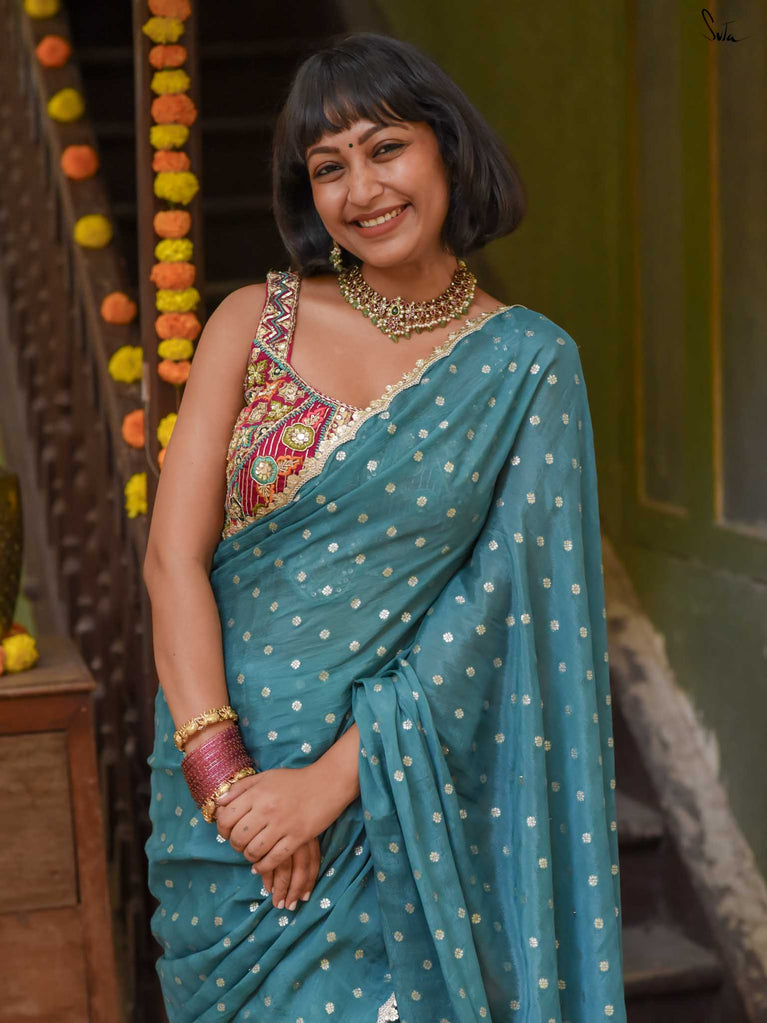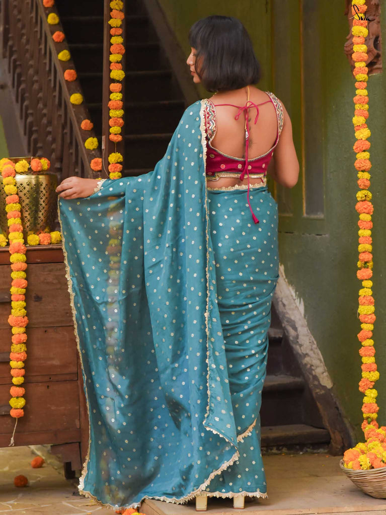 Striking, graceful, and full of charm - this teal viscose-blend saree is designed to stand out beautifully in any celebration. The soft, fluid drape is adorned with light gold woven buttis, adding a subtle shimmer that plays gently with movement. Finished with an embroidered scallop lace, it carries an elegant touch perfect for weddings, sangeet evenings, and joyful family gatherings.