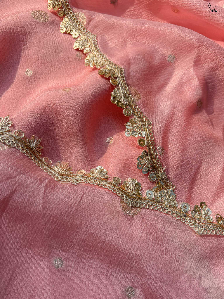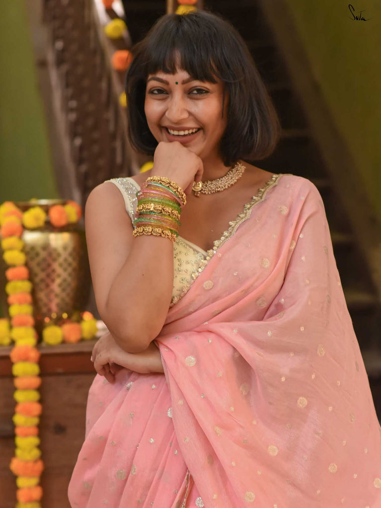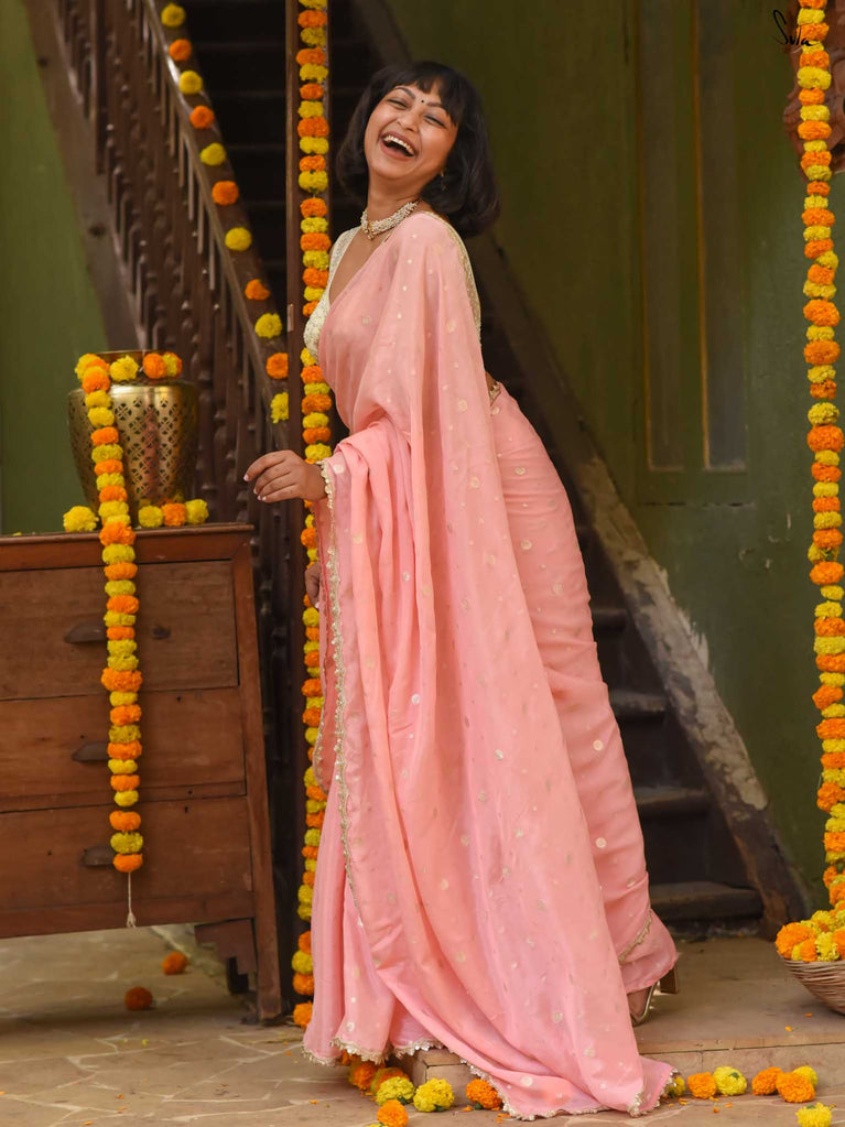 Soft & graceful - this baby pink viscose-blend saree brings a gentle elegance to every occasion. The smooth drape is sprinkled with light gold woven buttis, adding a subtle glow that enhances its pastel charm. Finished with an embroidered scallop lace, it offers a delicate, refined look perfect for daytime weddings, pre-wedding rituals, and intimate celebrations.