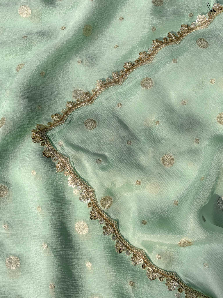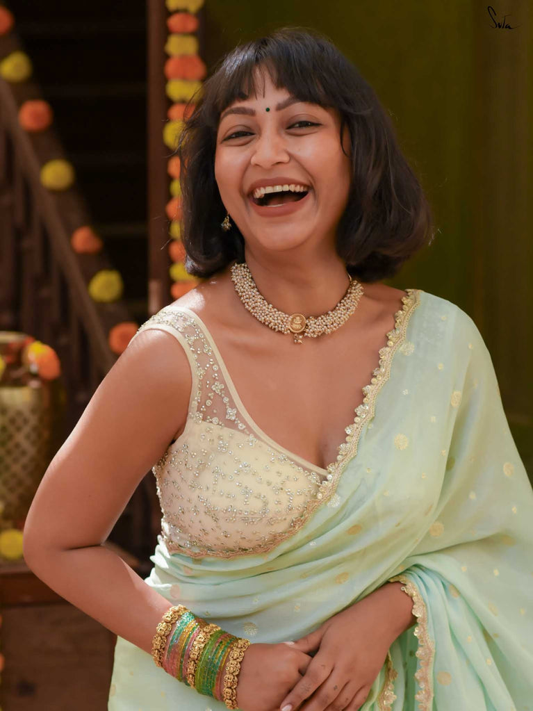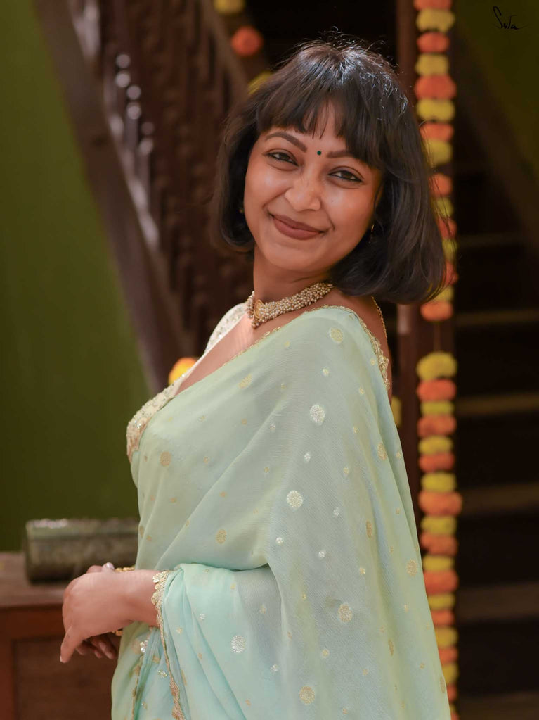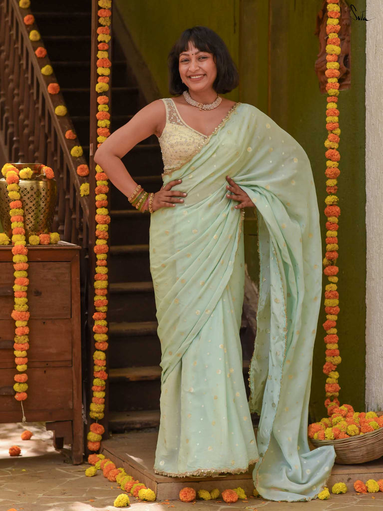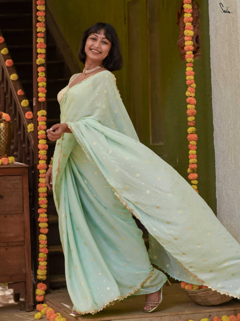 Fresh, calm, and radiant - this mint green viscose-blend saree brings a cool elegance to the shaadi season. The fluid drape is accented with light gold woven buttis, adding a soft, luminous sparkle as you move. The embroidered scallop lace frames the saree with a delicate finish, making it perfect for daytime weddings, mehendi functions, and intimate celebrations.