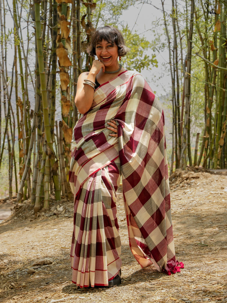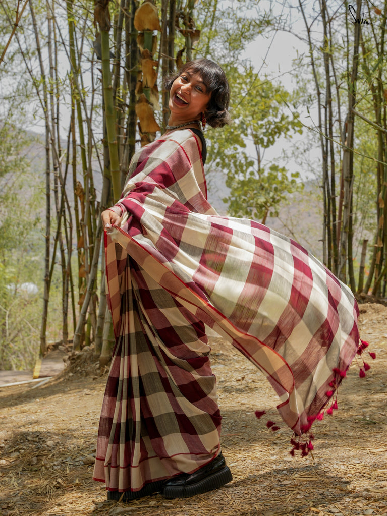 Dil Ka Jigsa, saree that's the perfect puzzle piece for your style! Made from soft cotton slub, this multicolored beauty features a detailed maroon border, tassels, and timeless chequered design, creating a cozy yet chic vibe. It’s your go-to for every occasion, whether it’s a casual day out or a special celebration. Pair it with our Gothic Dreams blouse, and voilà your look is complete!