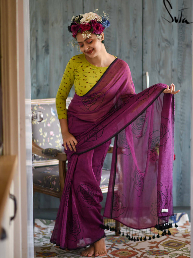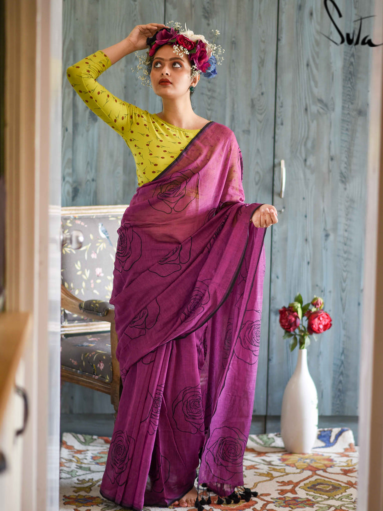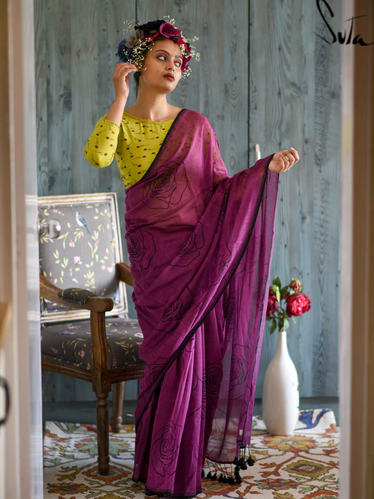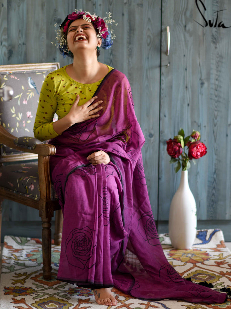 This purple made-in-heaven mul saree with the prettiest screenprinted design is a stunner!
