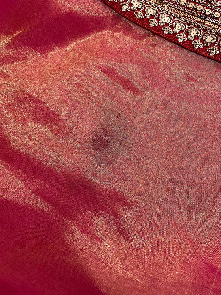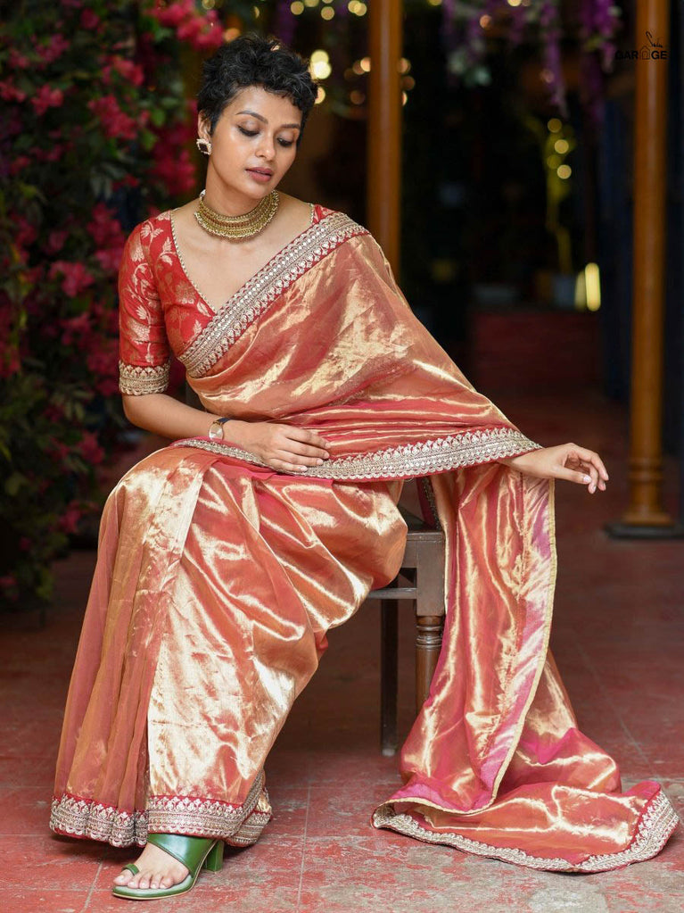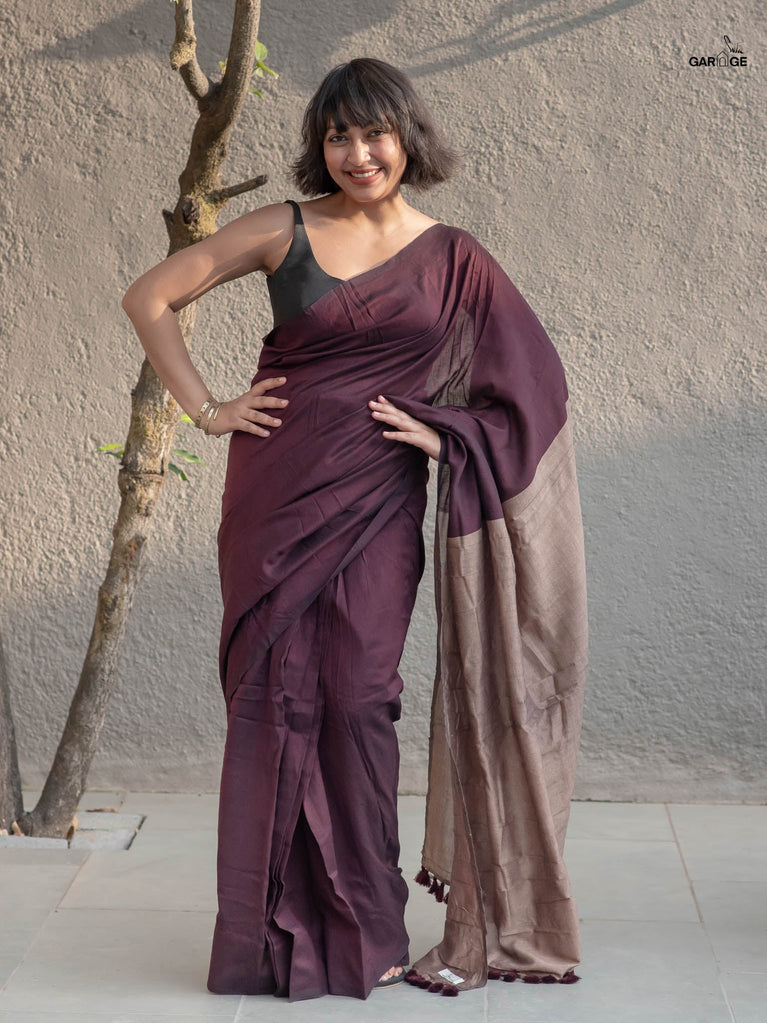 Suvarna Rekha, a dual-colored copper tissue cotton saree with an elegant wine-colored jacquard border, embodies the essence of luxury and warmth. "Suvarna," meaning "golden," reflects the richness of joyous moments, making it perfect for celebrations that deserve to be cherished. Let this saree wrap you in its radiant charm, reminding you that every day holds the potential for brilliance.