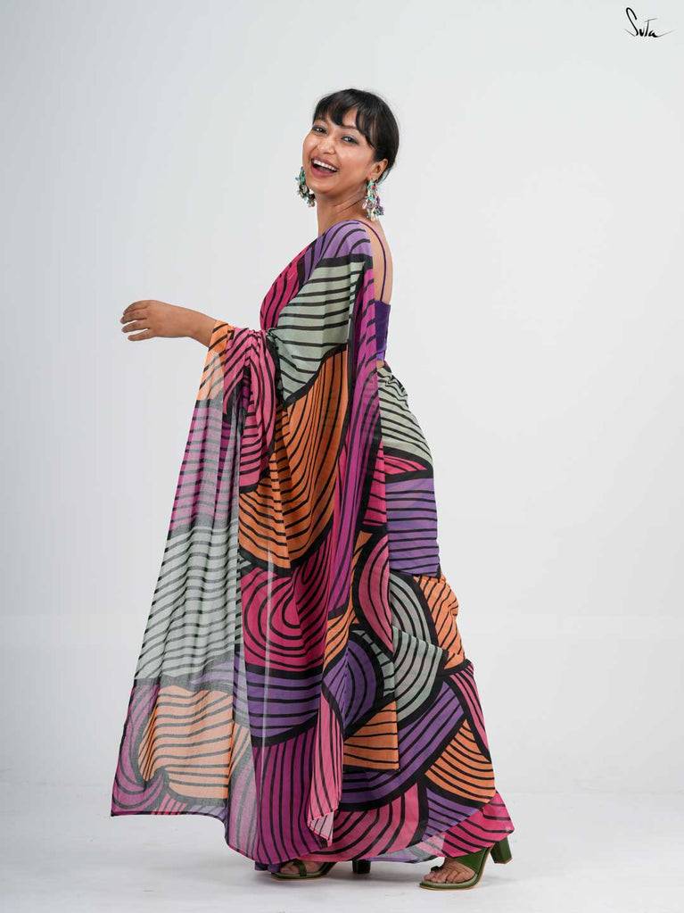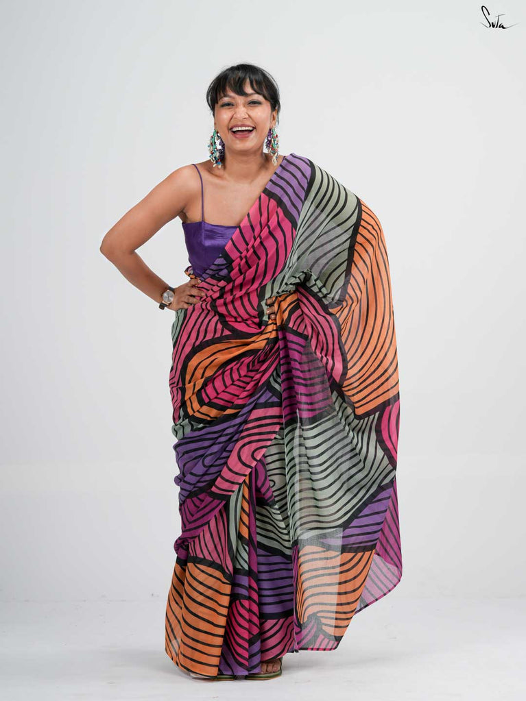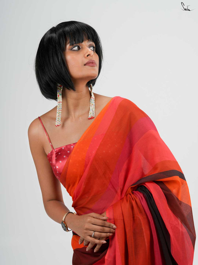 A rainbow of tradition, this multicolored mul khesh saree captures the essence of Holi in its vibrant, handwoven stripes. Each handwoven thread tells a story of craftsmanship passed down through generations, woven with care and joy. The playful jhalar tassels, like droplets of color, swing with every step, carrying a mischievous wink that only the festival of colors can bring. Wrapped in this saree, you’re wearing the spirit of an age-old tradition, reimagined for today’s celebrant.