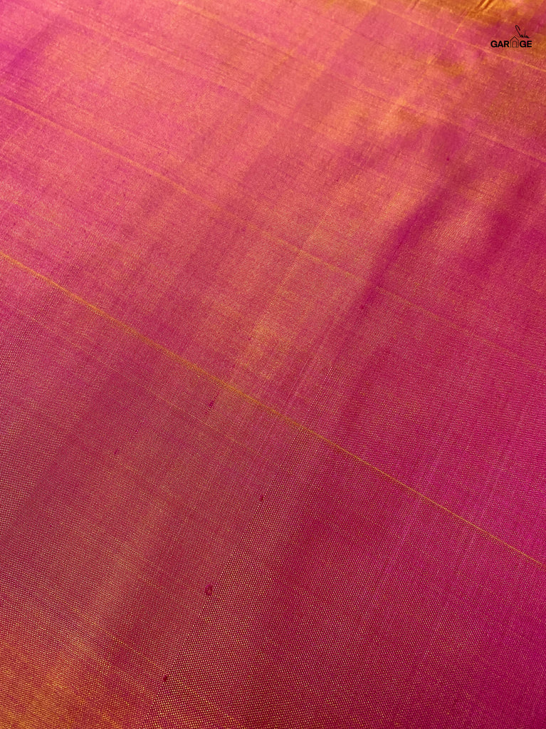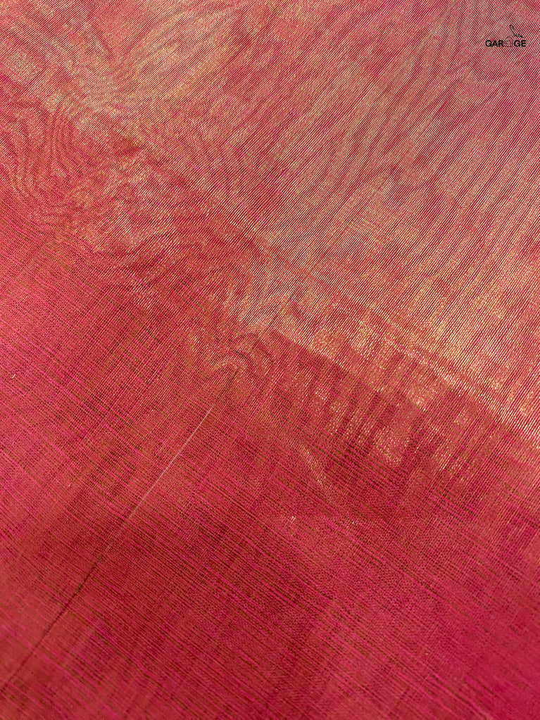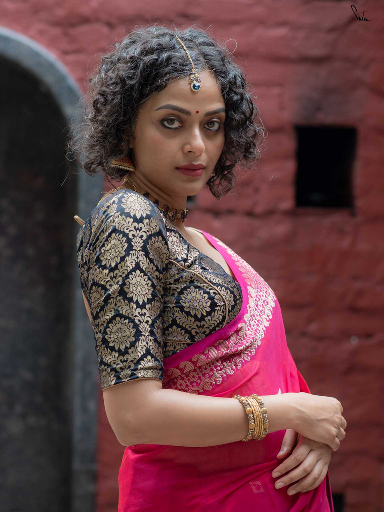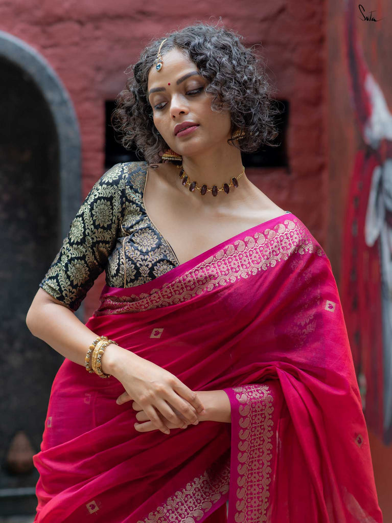 A pink and orange striped cotton saree that radiates warmth and playfulness, finished with a contrast green jacquard border that makes the whole piece pop. What makes it precious is its easy versatility — light enough for everyday wear yet striking enough to turn heads on festive mornings. It’s that saree you’ll keep reaching for when you want effortless charm with a dash of boldness.