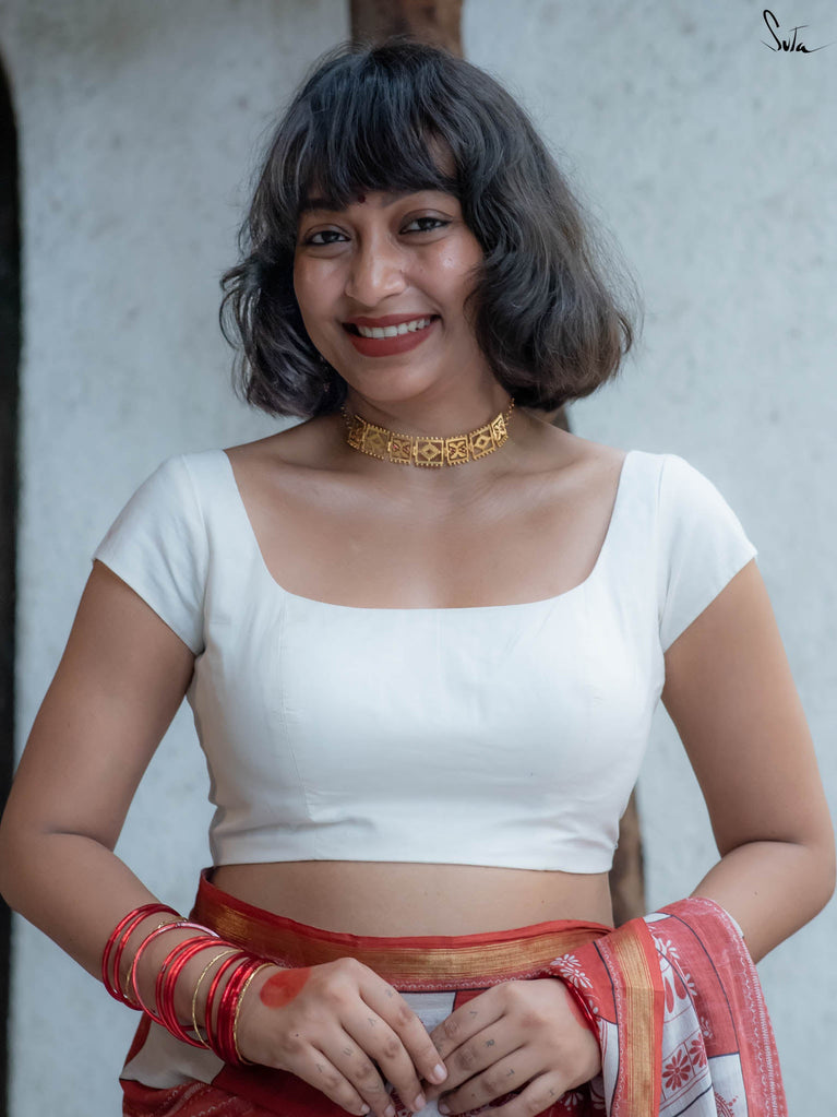 Simple never looked this striking. This white cotton blouse with a clean U-neckline is that quiet essential every Pujo wardrobe needs. Breathable, easy, and endlessly versatile, it slips into your festive line-up without asking for effort.
