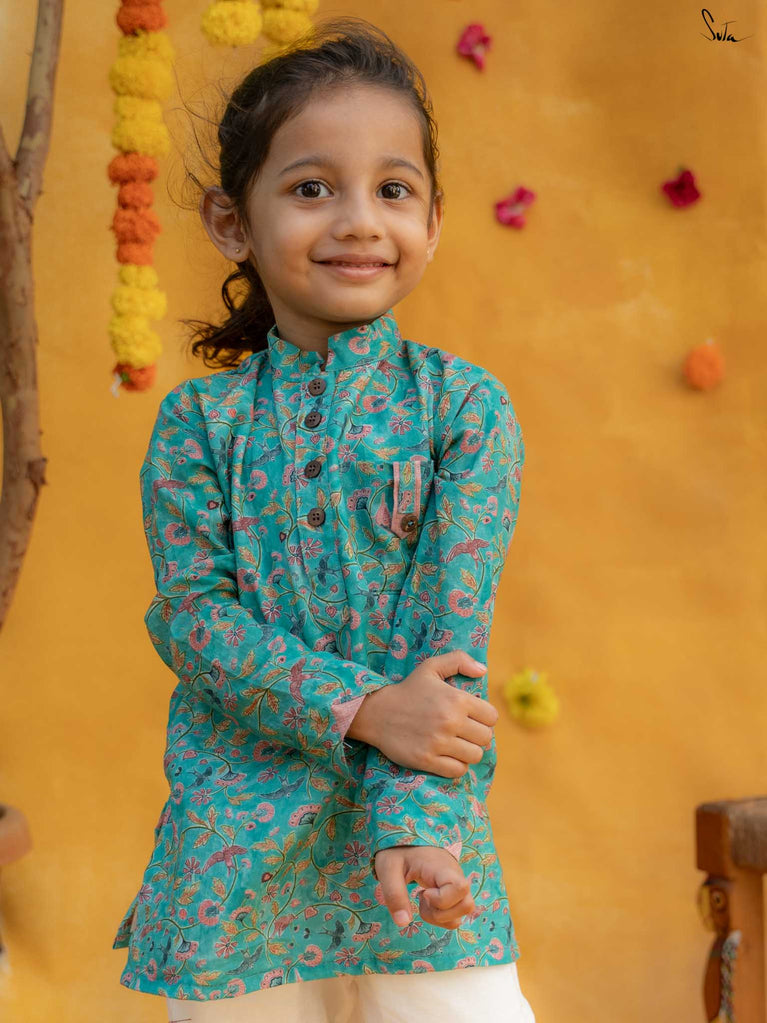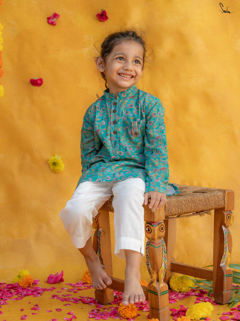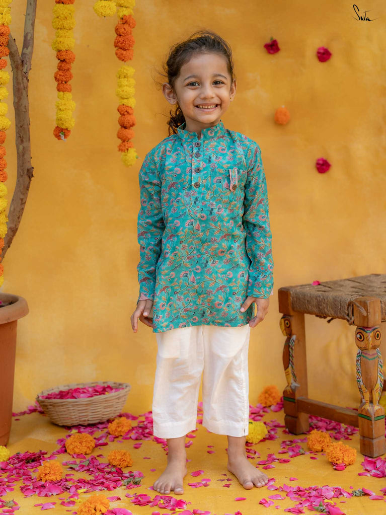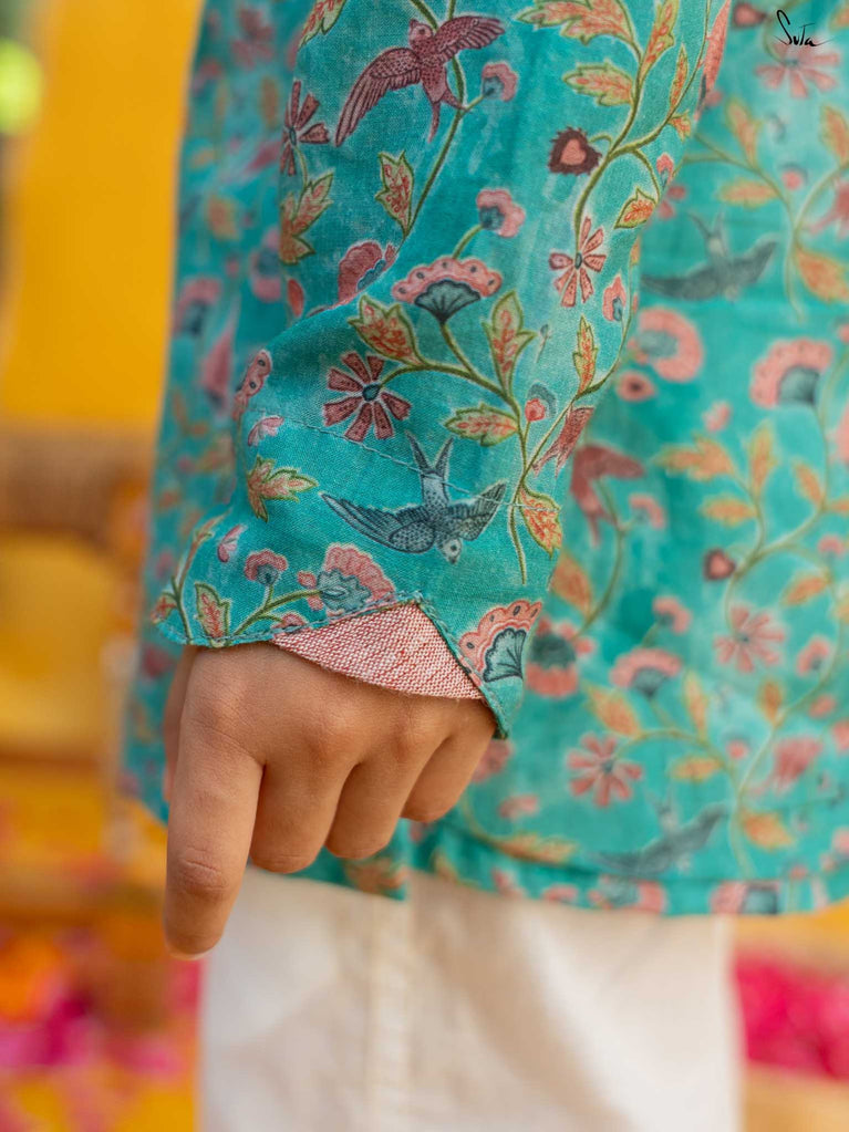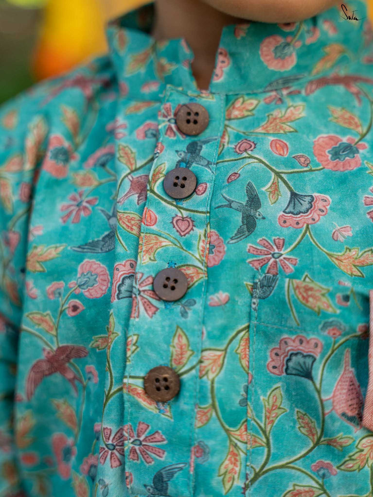 A song of colour and play, Bulbul is designed for the little gentlemen to shine. The kurta, in soft sushi voile, pairs lightness with festivity, while the cotton cambric pajama ensures all-day ease. The full-sleeve kurta features a cheerful digital print of flowers and birds, bringing a playful touch to traditional wear. A front button opening makes it easy to slip on, and side pockets add a practical twist for little treasures. The crisp white pajama pants come with an elasticated waistband and side pockets, perfect for morning aartis to evening fun.